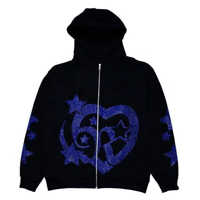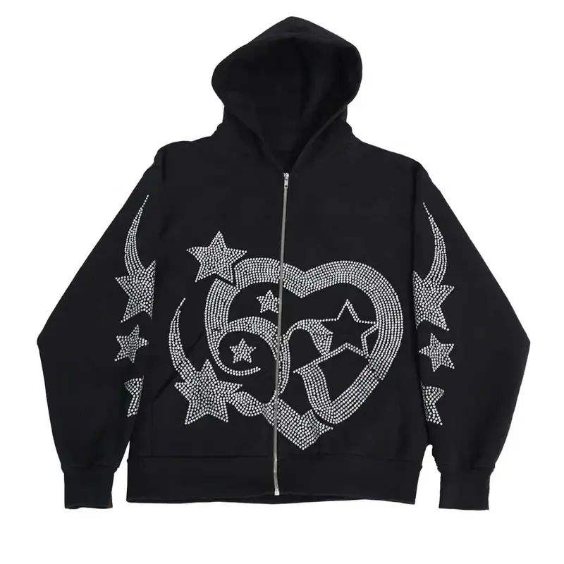 Sweat-shirt à capuche intégral zippé pour homme personnalisé, en molleton 100% coton, avec strass argentés, respirant et écologique