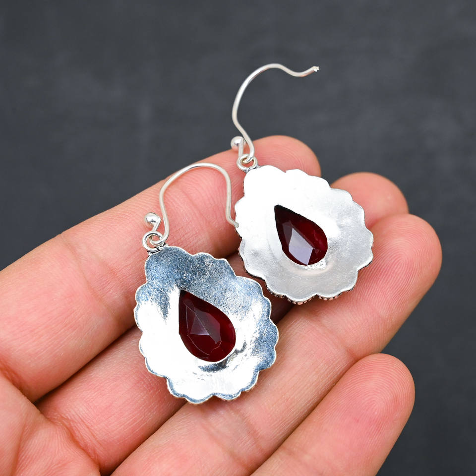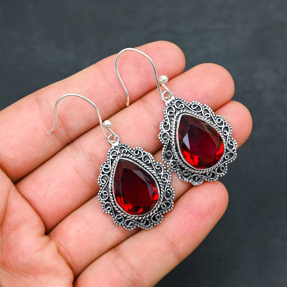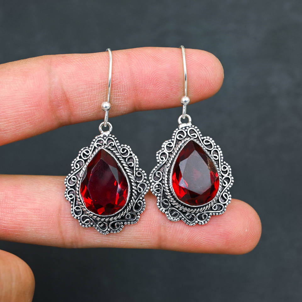 Boucles d'oreilles personnalisées en argent sterling 925 avec grenat rouge créé en laboratoire, 1,9 pouce, bijoux en pierres précieuses faits à la main, boucles d'oreilles fines antiques, cadeau pour femme