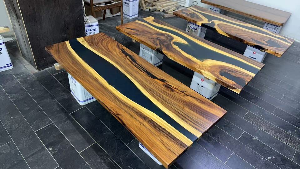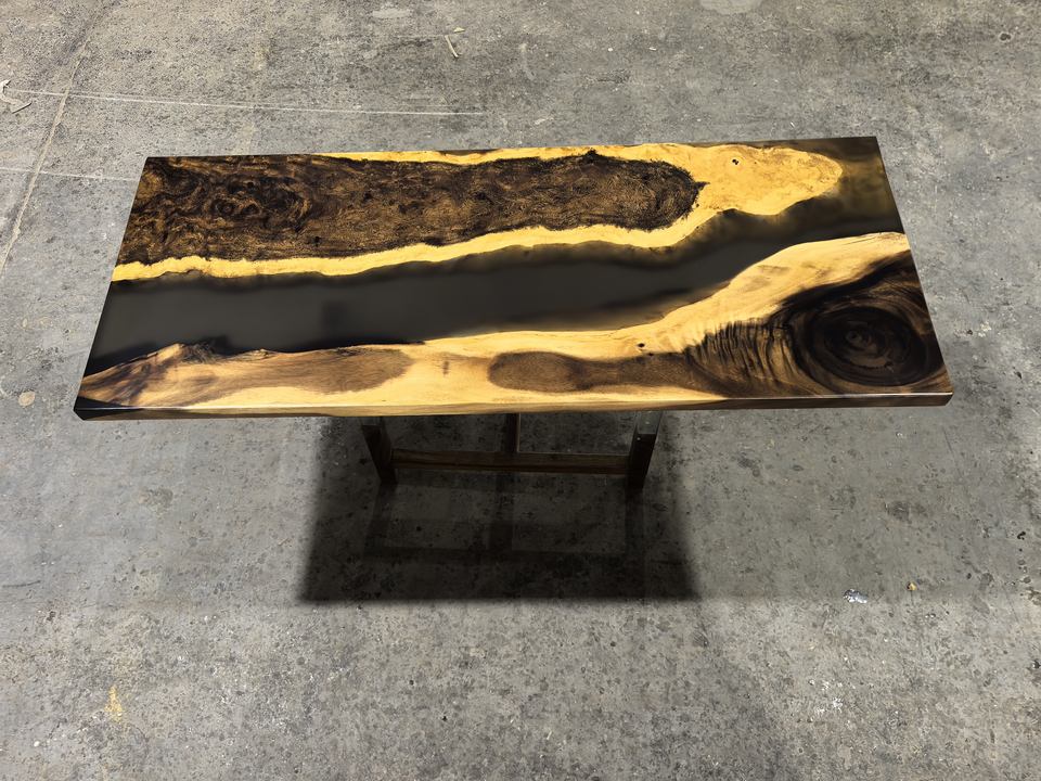 Table en bois et acier sur mesure pour salle de réunion, bureau, restaurant, avec base de pieds en bois, noyer noir d'Amérique du Sud, résine époxy
