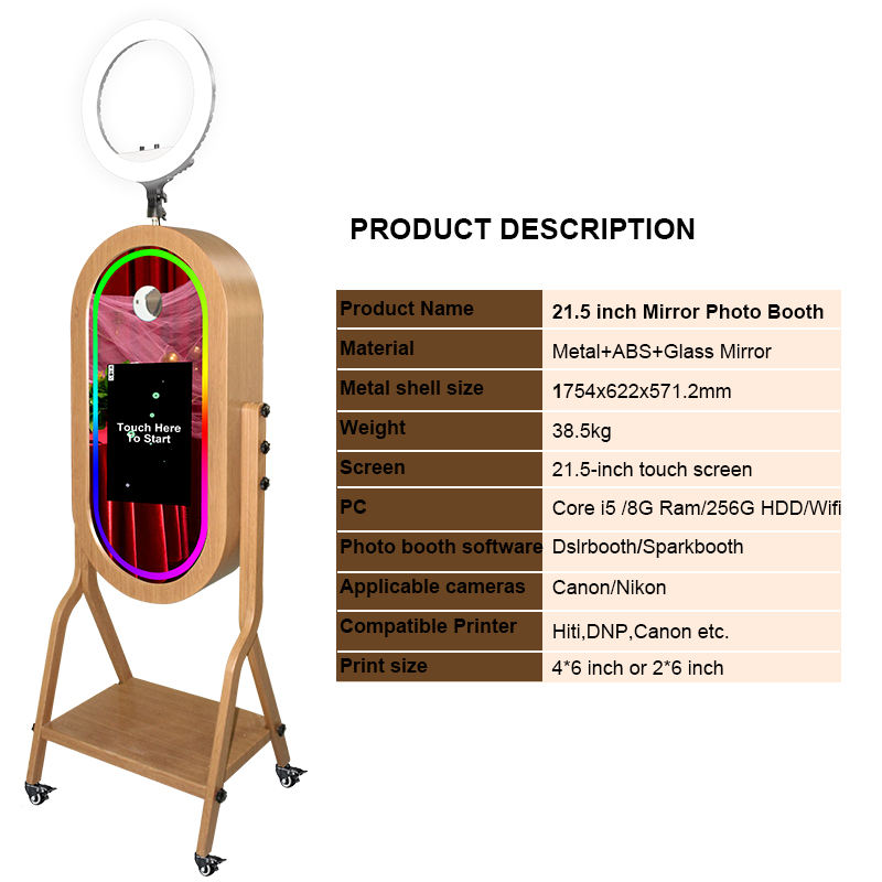 Cabine Photo Personnalisable Grain de Bois 21,5" avec Écran Tactile, Miroir Magique, Appareil Photo et Imprimante