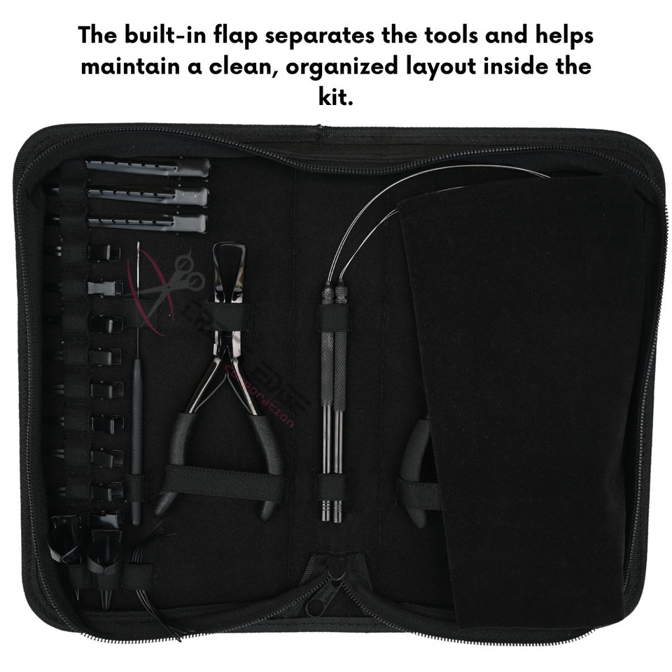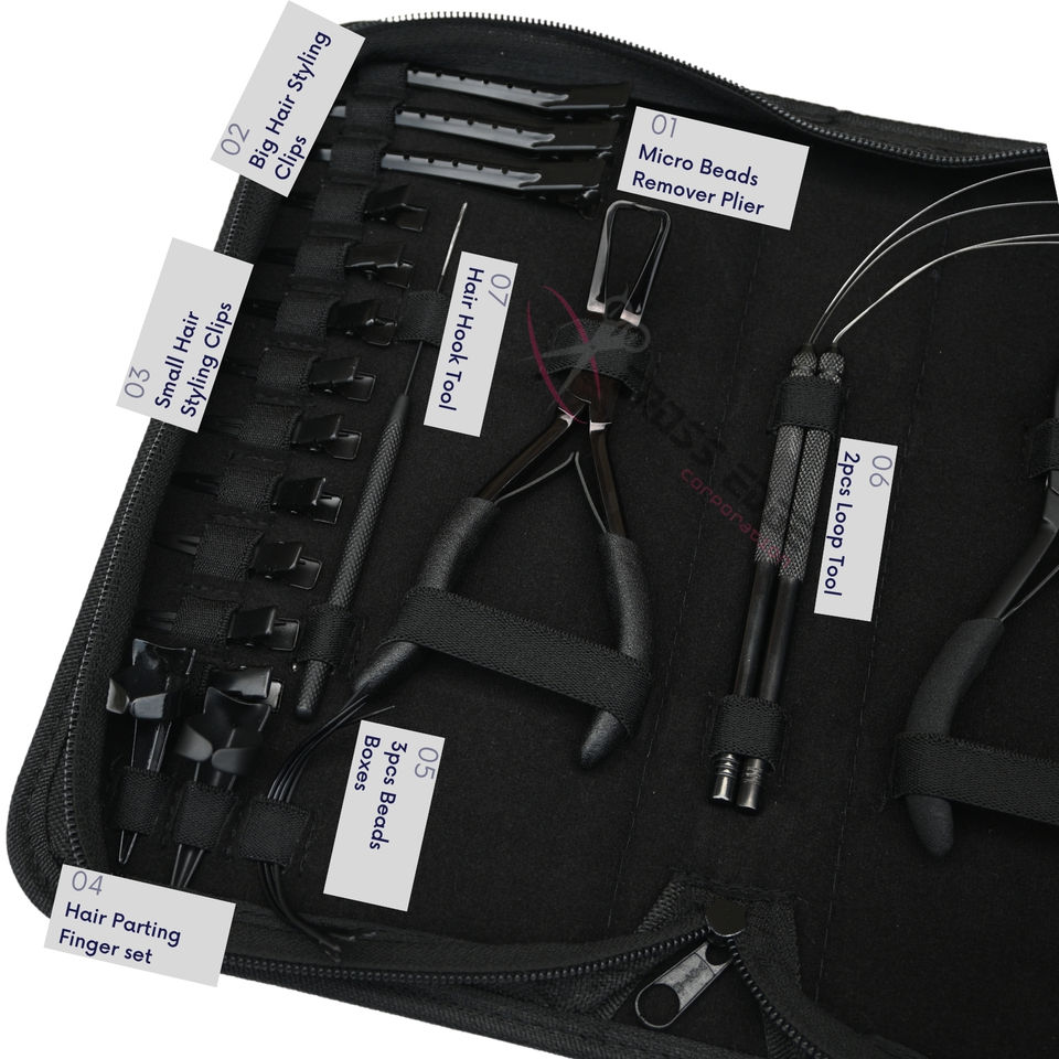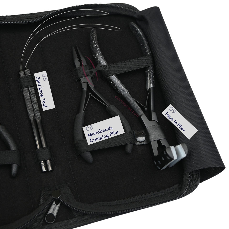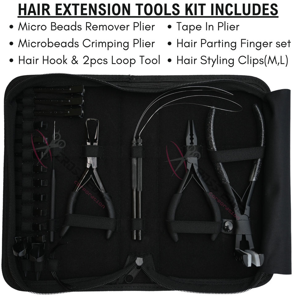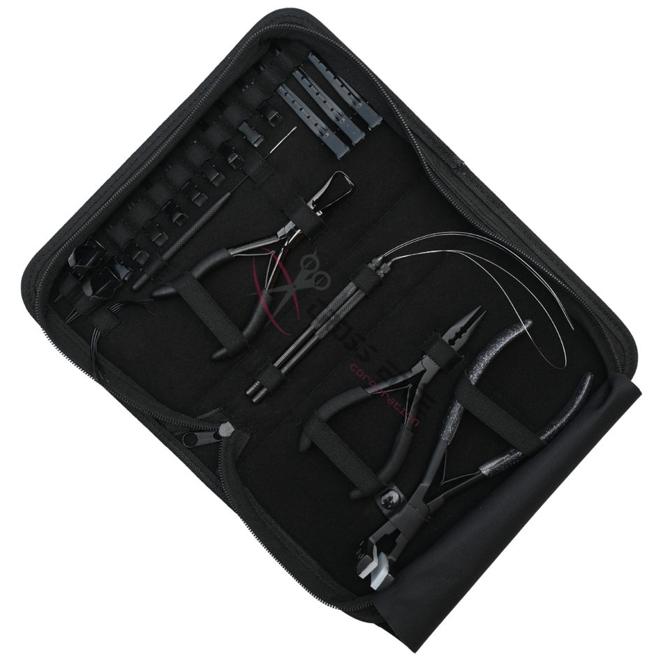 Kit d'outils personnalisables pour extensions de cheveux noirs : Pince à bandes adhésives noires, Outil de retrait de micro-perles, Outil de sertissage, Crochet de tirage et Pinces de coiffage