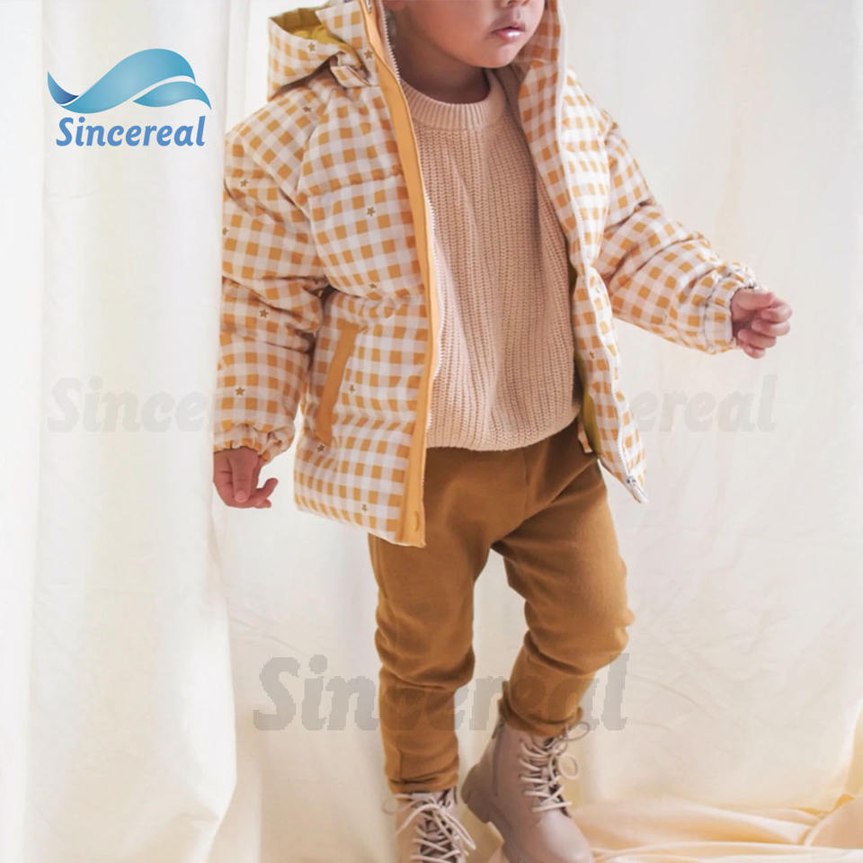 Doudoune d'hiver personnalisable pour garçon avec imprimé vichy imperméable et étoiles dorées capuche zippée amovible motif écossais