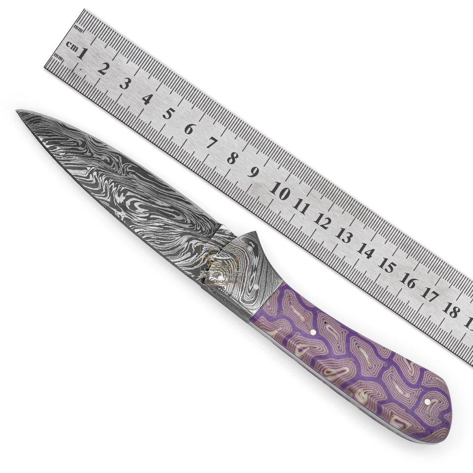 Couteau de chasse EDC en acier Damas personnalisable DD-DAM-566, 9 cm, 58-60 HRC, manche en micarta blanc et violet, prise en charge OEM ODM