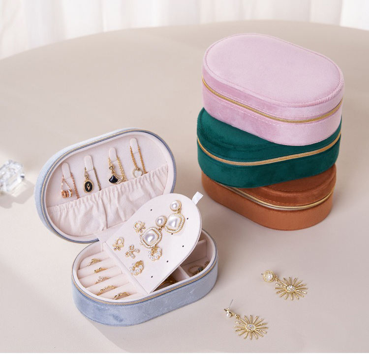 Organisateur de bijoux portable simple à double couche personnalisable avec fermeture éclair, boîte de rangement ovale en velours coloré avec logo personnalisé