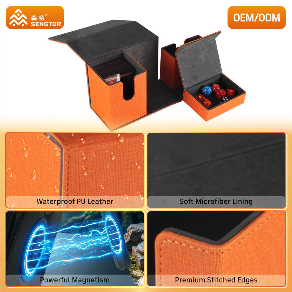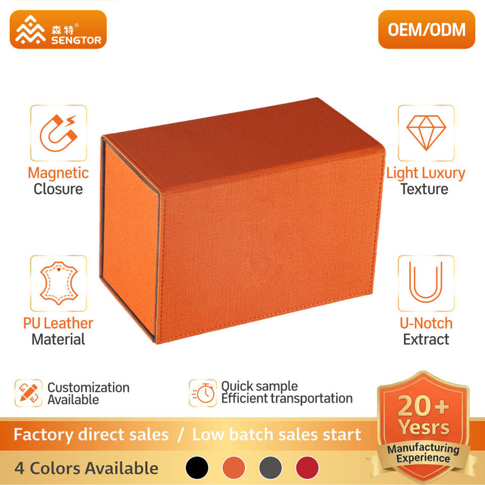 Boîte de rangement à rabat en PU orange, personnalisable, flexible et résistante aux rayures, pour la protection des jeux de cartes