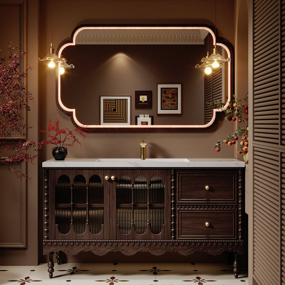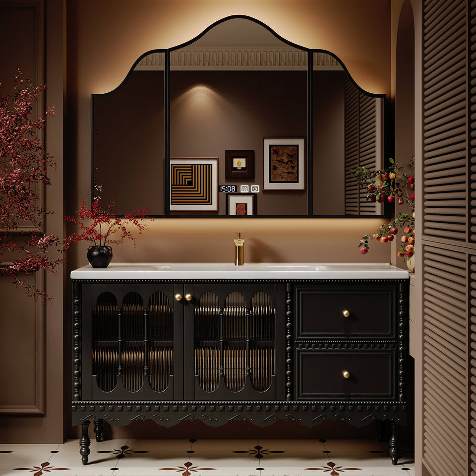 Meuble-lavabo de salle de bain personnalisable de style français, portes noires sculptées, poignées en laiton