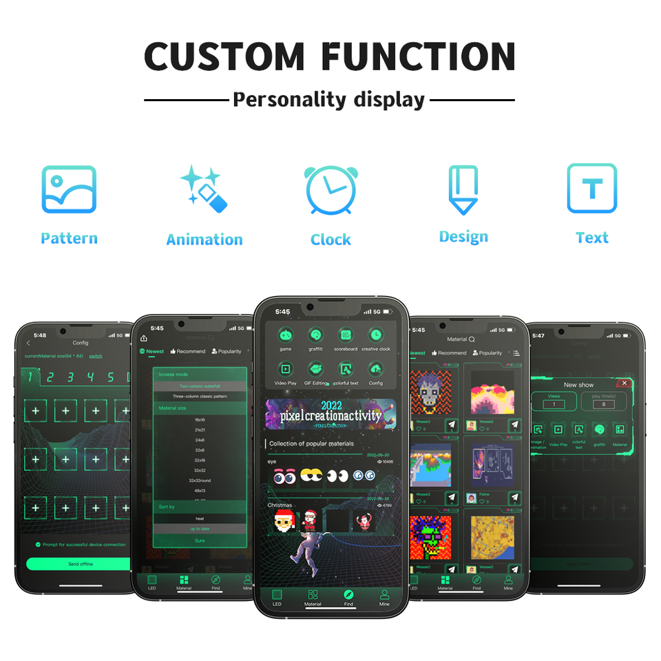 Fonction d'affichage:Affichage d'horloge, Compte à rebours, Adapté aux besoins du client, Affichage de la date, Affichage du logo, Texte défilant, Texte statique, Affichage météo