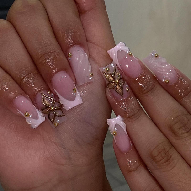 Faux ongles de luxe 3D personnalisables à bout français moyen, motif doré, pour doigts, vente en gros
