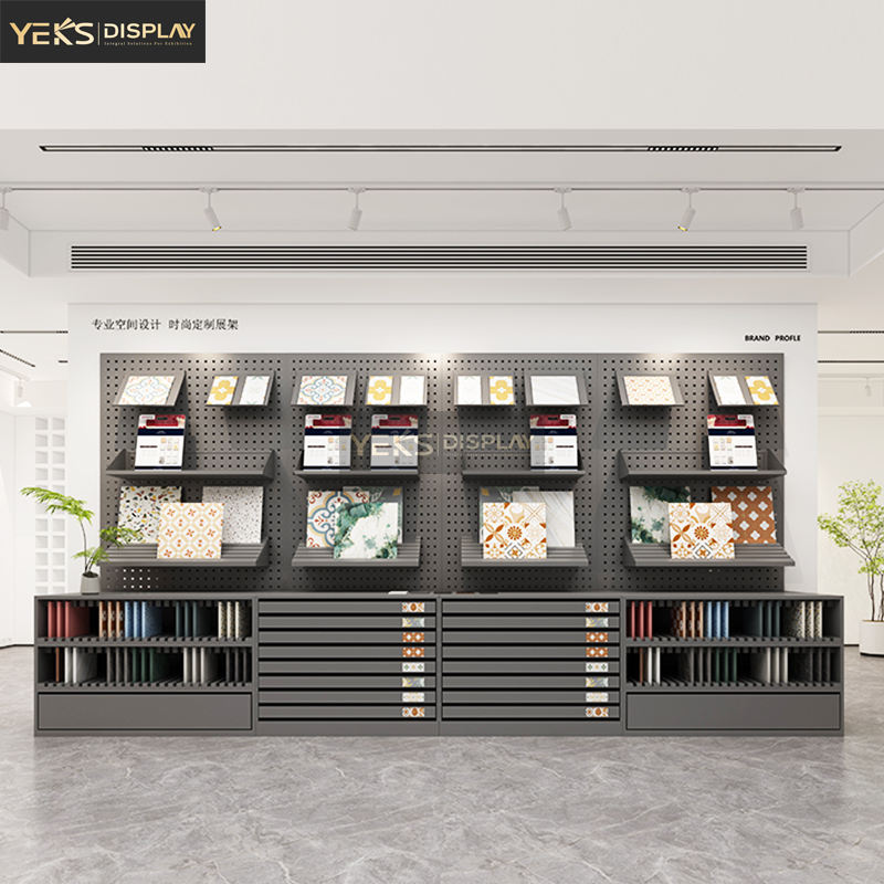 Étagère de présentation combinée en métal personnalisable, support de carrelage commercial en panneau perforé, étagère murale de rangement pour salle d'exposition