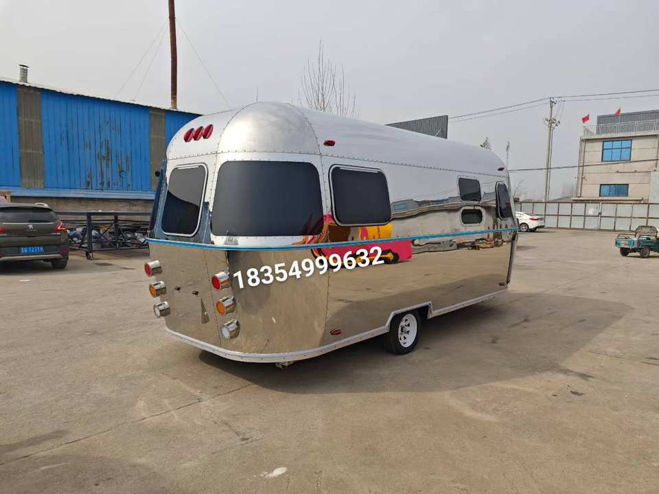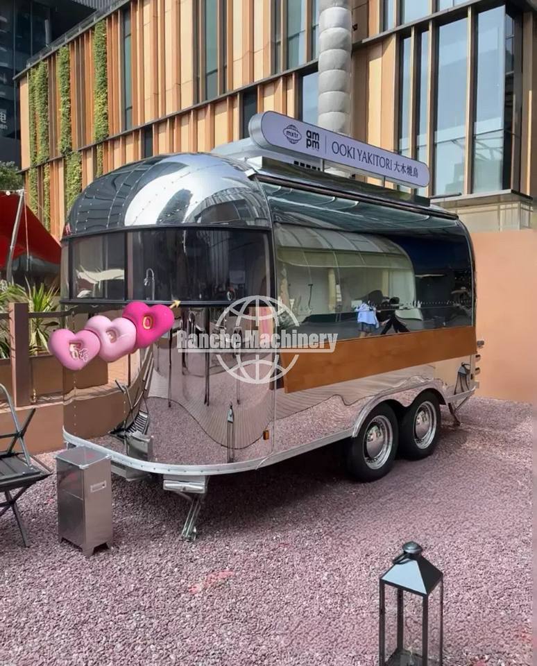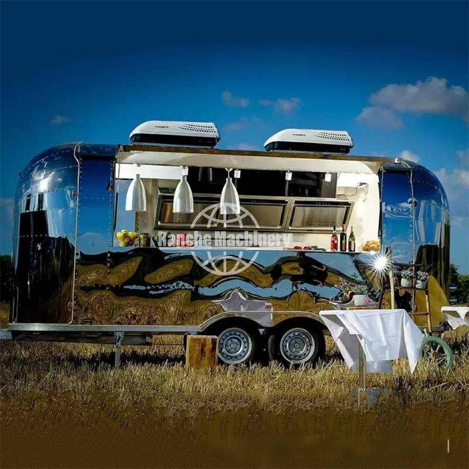 Camion de restauration mobile personnalisable, entièrement équipé en acier inoxydable, pour la vente de frites, glaces et snacks, avec bar et remorque de type van
