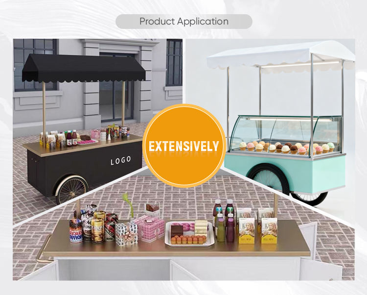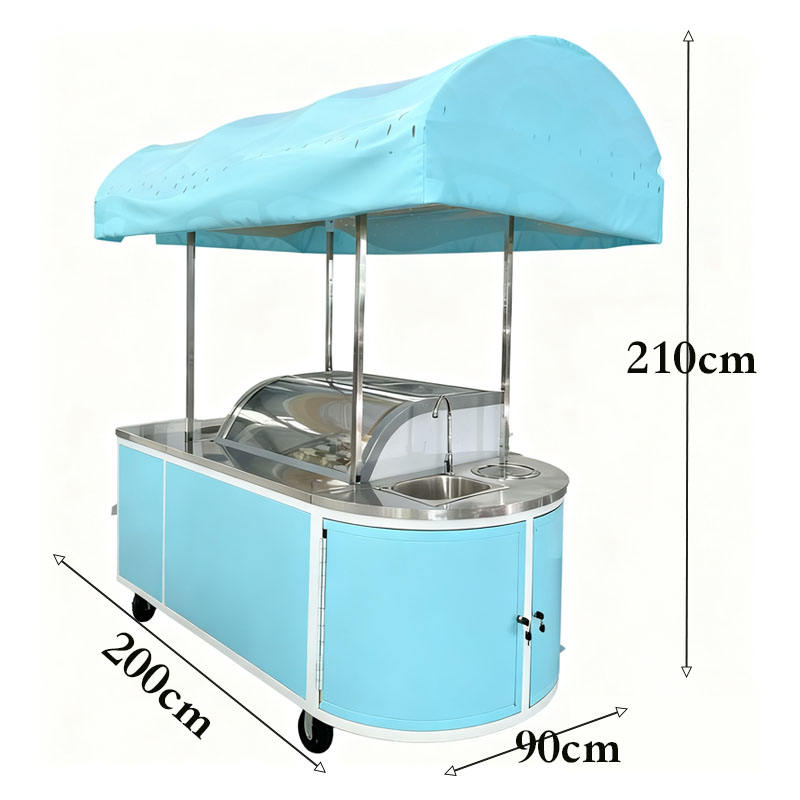 Chariot alimentaire mobile personnalisable avec auvent et vitrine en verre pour la vente de café, de thé et de desserts glacés