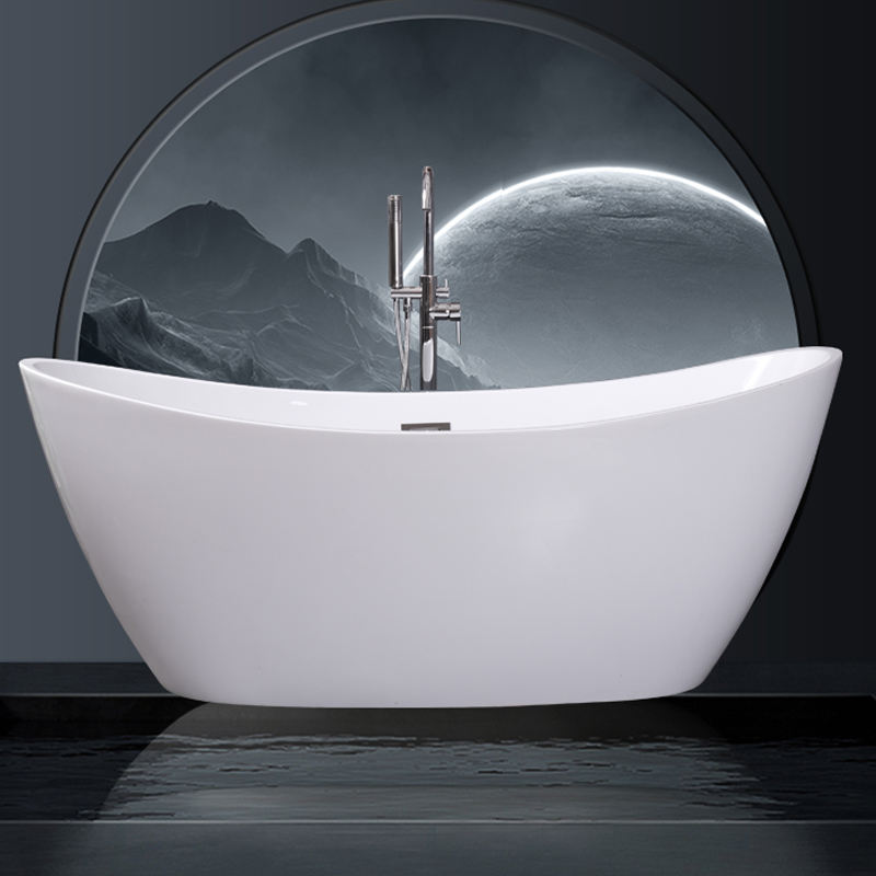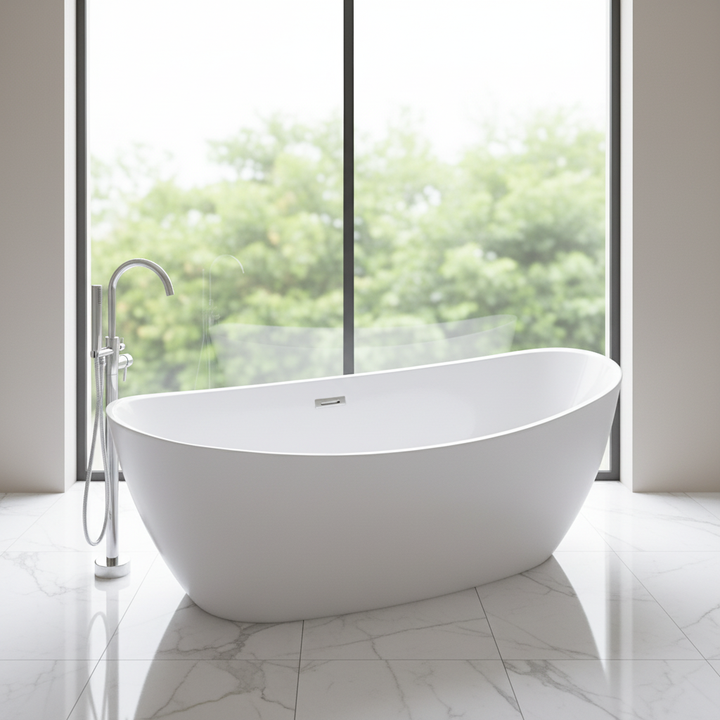 Baignoire autoportante moderne personnalisable, couleur blanche, profonde, avec drain, petite taille, fonctionnalités de bain à remous, appartement, intérieur