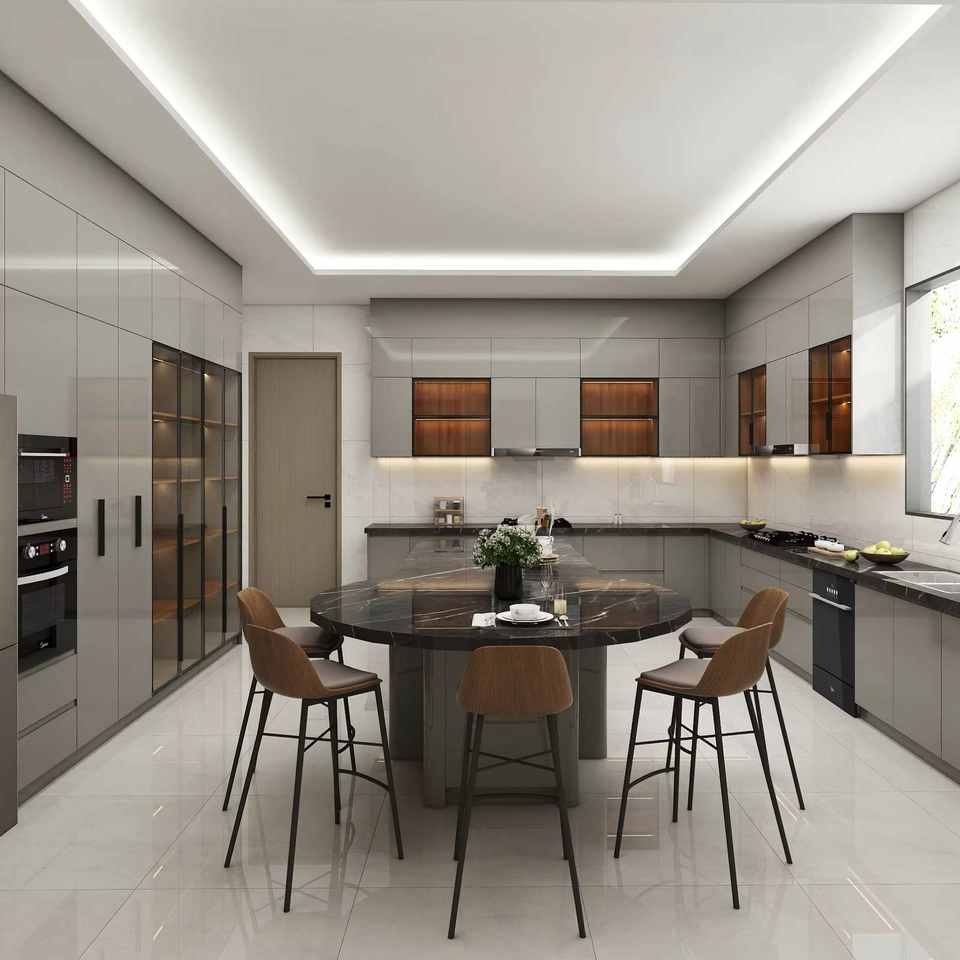 Armoires de cuisine modernes personnalisables avec plan de travail en marbre, design fonctionnel, style calme et élégant pour appartement