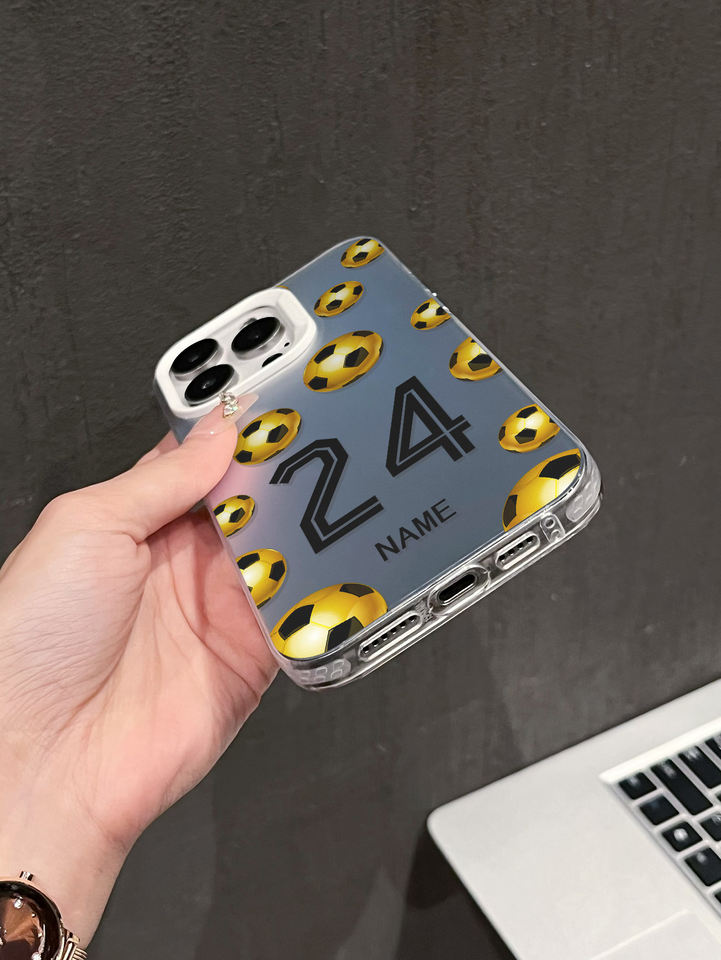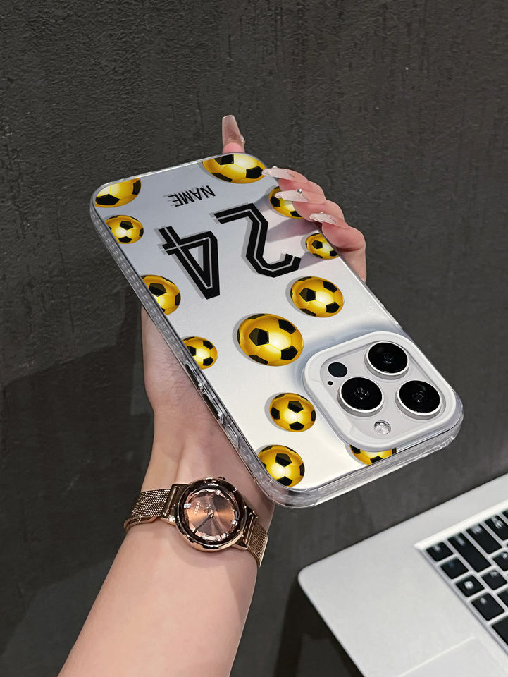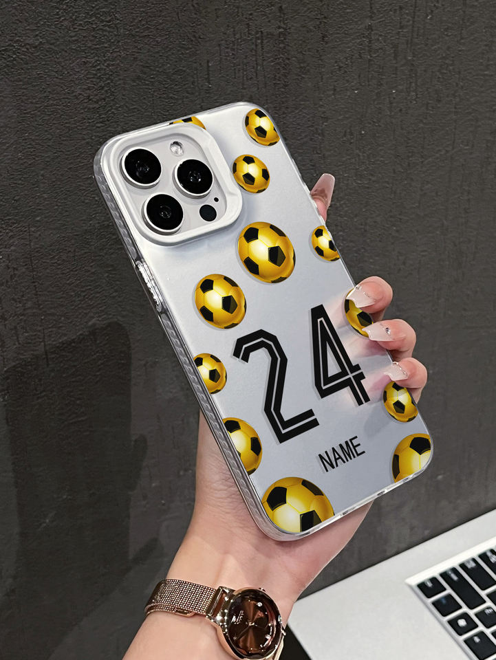 Étui personnalisable avec nom et numéro, motif football doré, coque antichoc réfléchissante argentée compatible avec 17/16/15/14/13 Pro Max