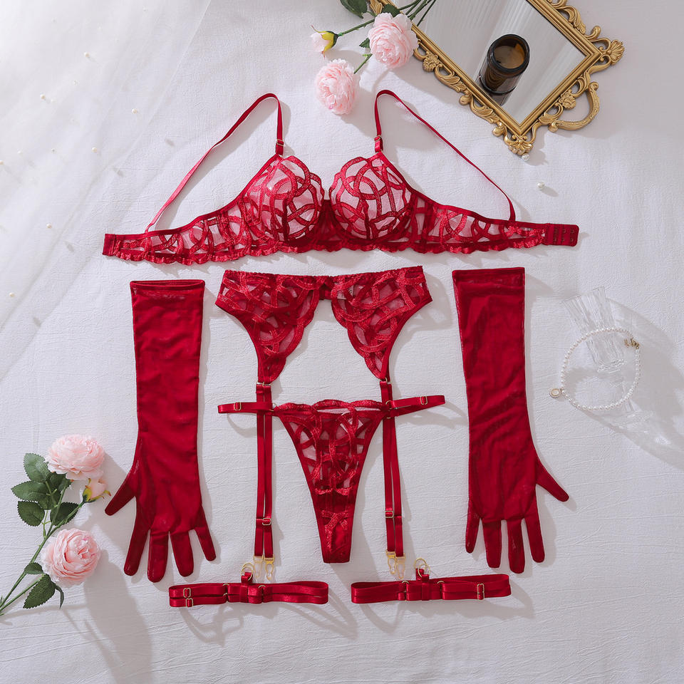 Ensemble de Lingerie Sexy Personnalisable en Dentelle Noire pour Femme – Soutien-Gorge Transparent Évidé, Culotte et Porte-Jarretelles – Ensemble 4 Pièces de Sous-Vêtements à Bretelles
