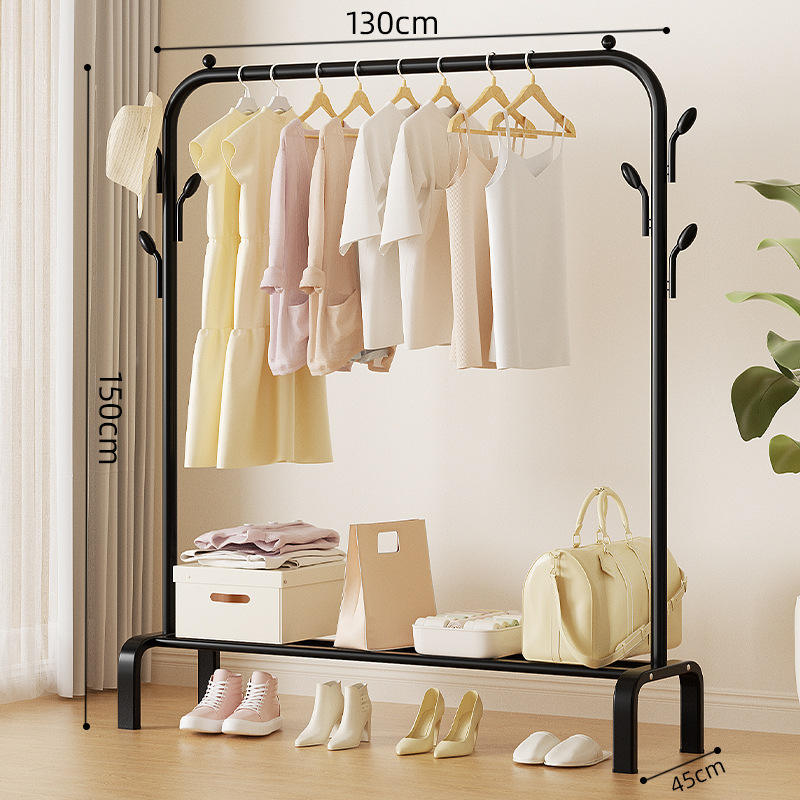 Étagère en tissu métallique à tige unique personnalisable avec 6 crochets Étagère inférieure mobile pour chaussures Vêtements Séchage Chambre Balcon Porte-vêtements