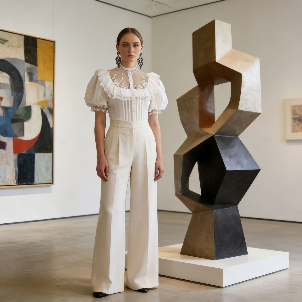 Chemise pour femme de style victorien personnalisable, élégante et féminine, col haut, manches bouffantes à volants, accent en tulle léger