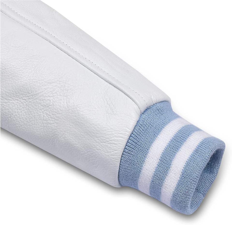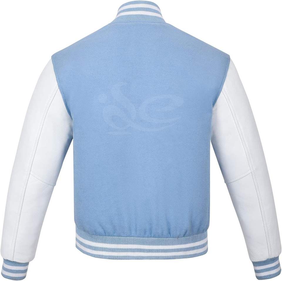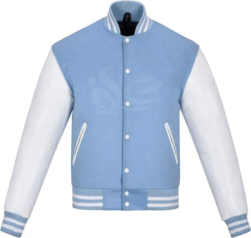 Veste universitaire vintage personnalisable pour homme en laine et cuir bleu ciel, style Letterman, manteau d'hiver respirant à col rond, logo personnalisé
