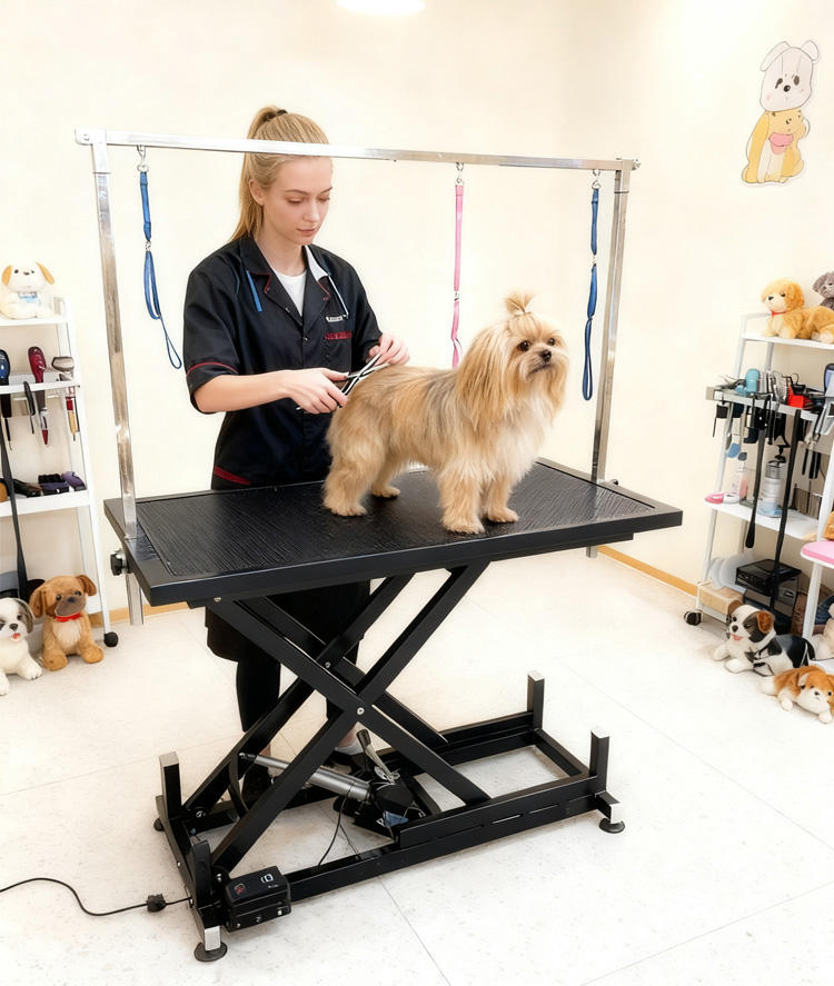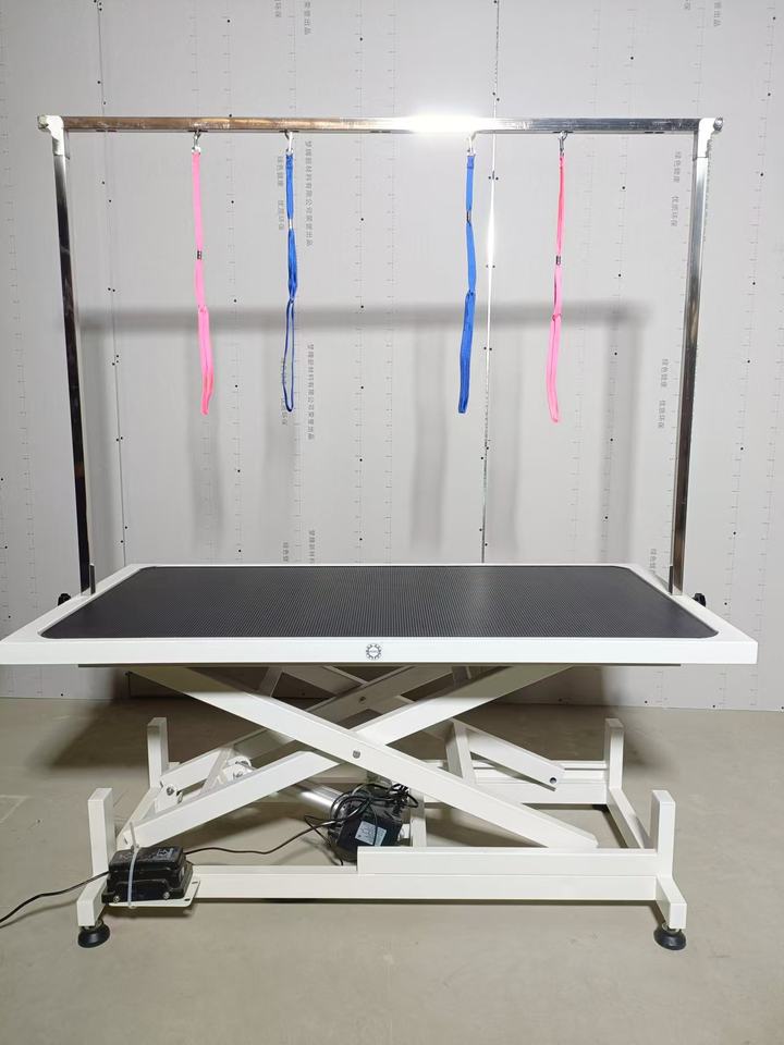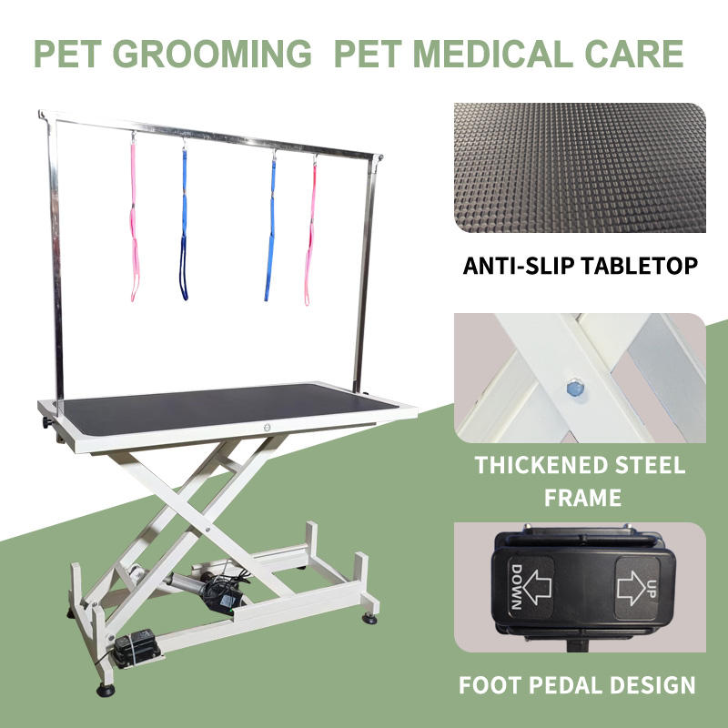 Table de toilettage pour chien blanche personnalisable avec moteur électrique, bras de table de toilettage et tapis durable, en vente pour la toilettage des animaux de compagnie