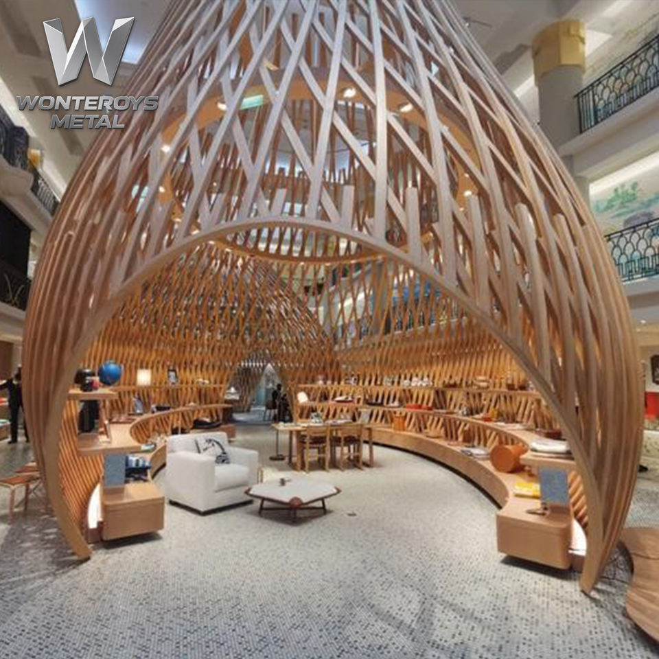 Cloison de séparation personnalisable en forme de cage à oiseaux en acier inoxydable couleur bois, idéale pour les hôtels, restaurants et cafés