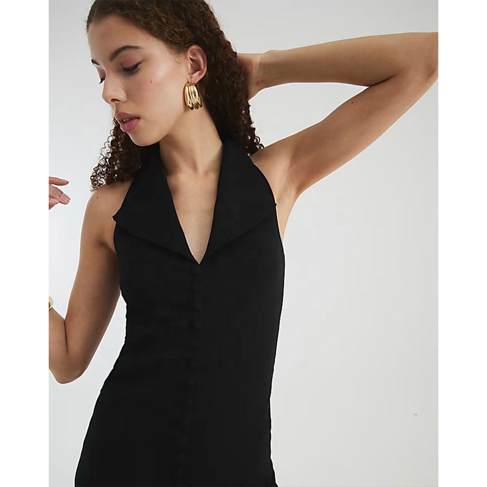 Robe midi élégante pour femmes, sans manches, à boutons, col en V, taille naturelle, noire, personnalisable, été 2025, OEM ODM