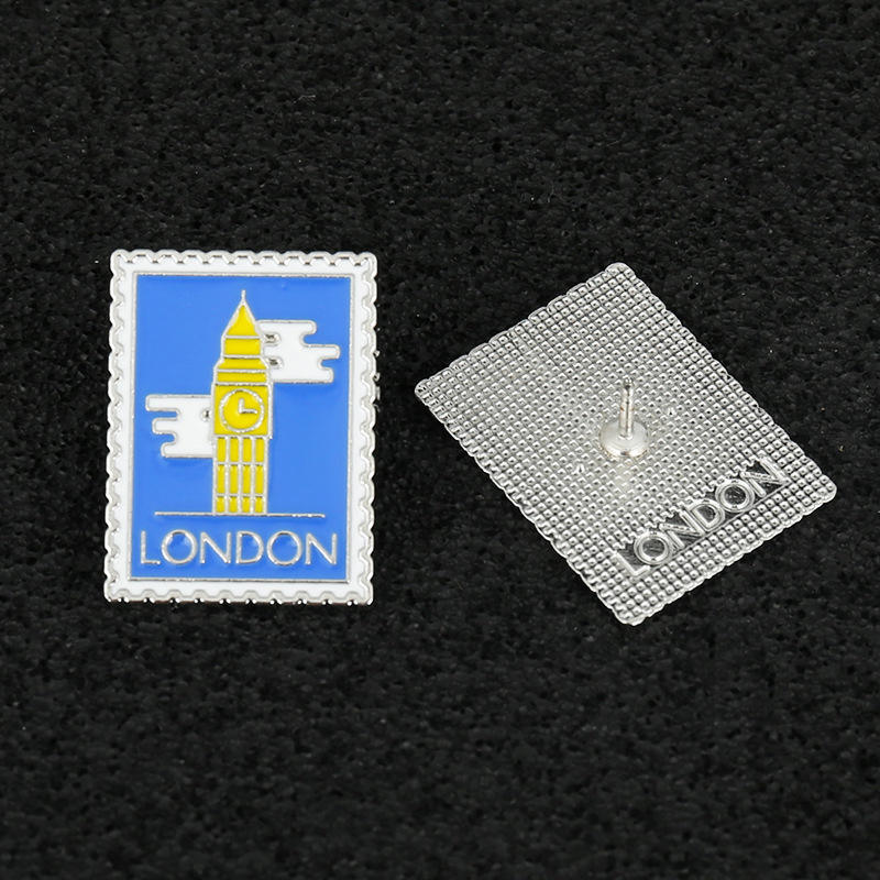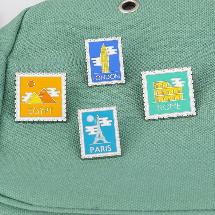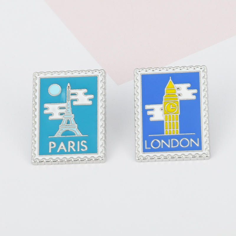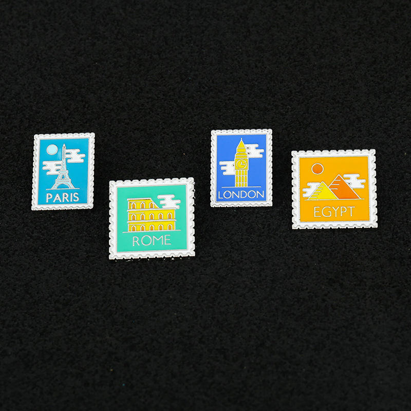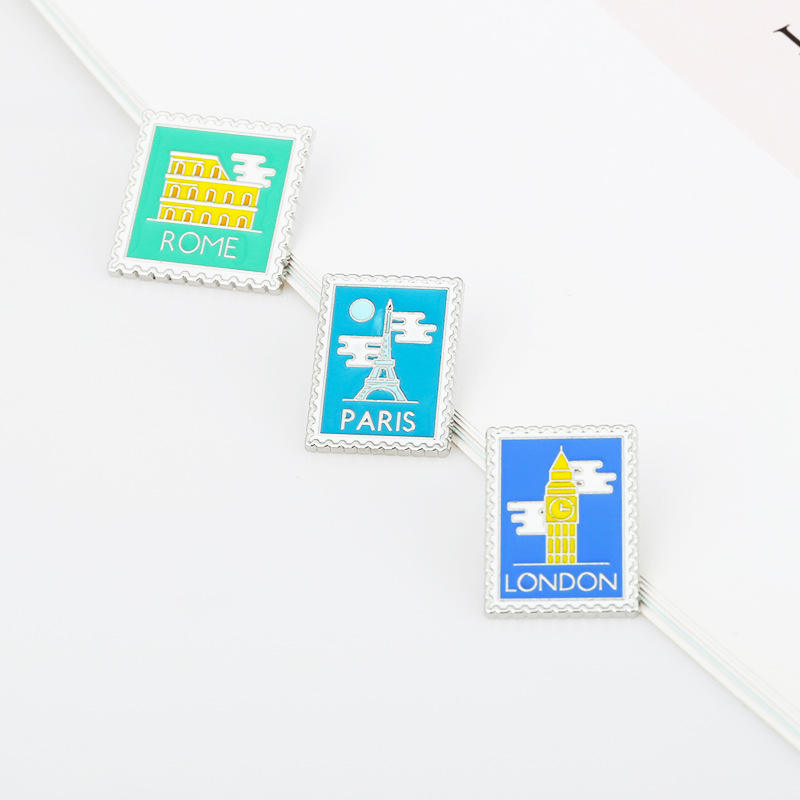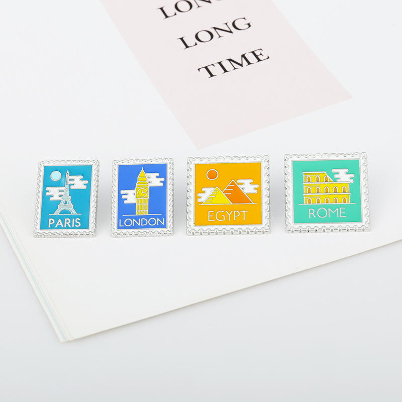 Insigne de dessin animé personnalisé créatif Londres Paris Rome timbre métal épingle Egypte pyramide dessin animé cadre photo épingle souvenir