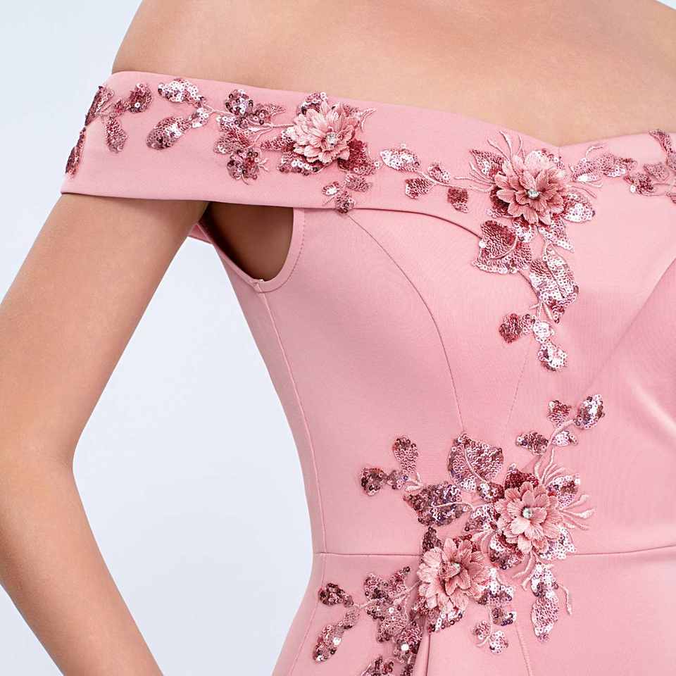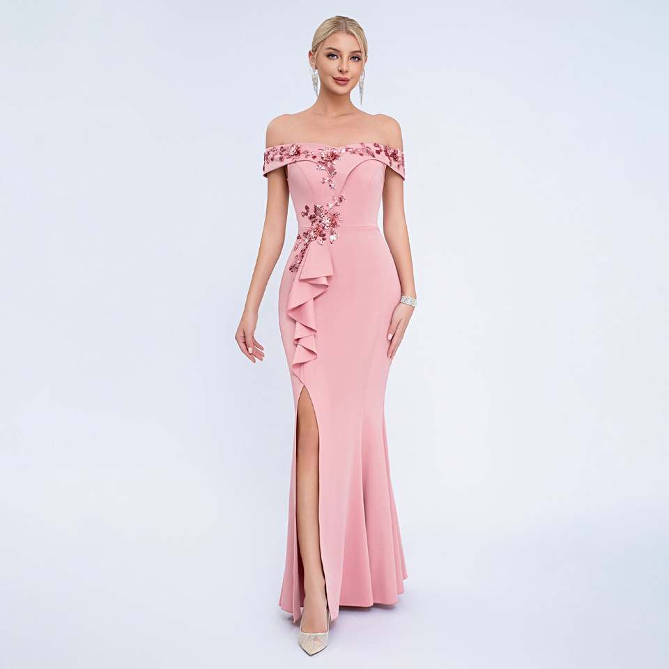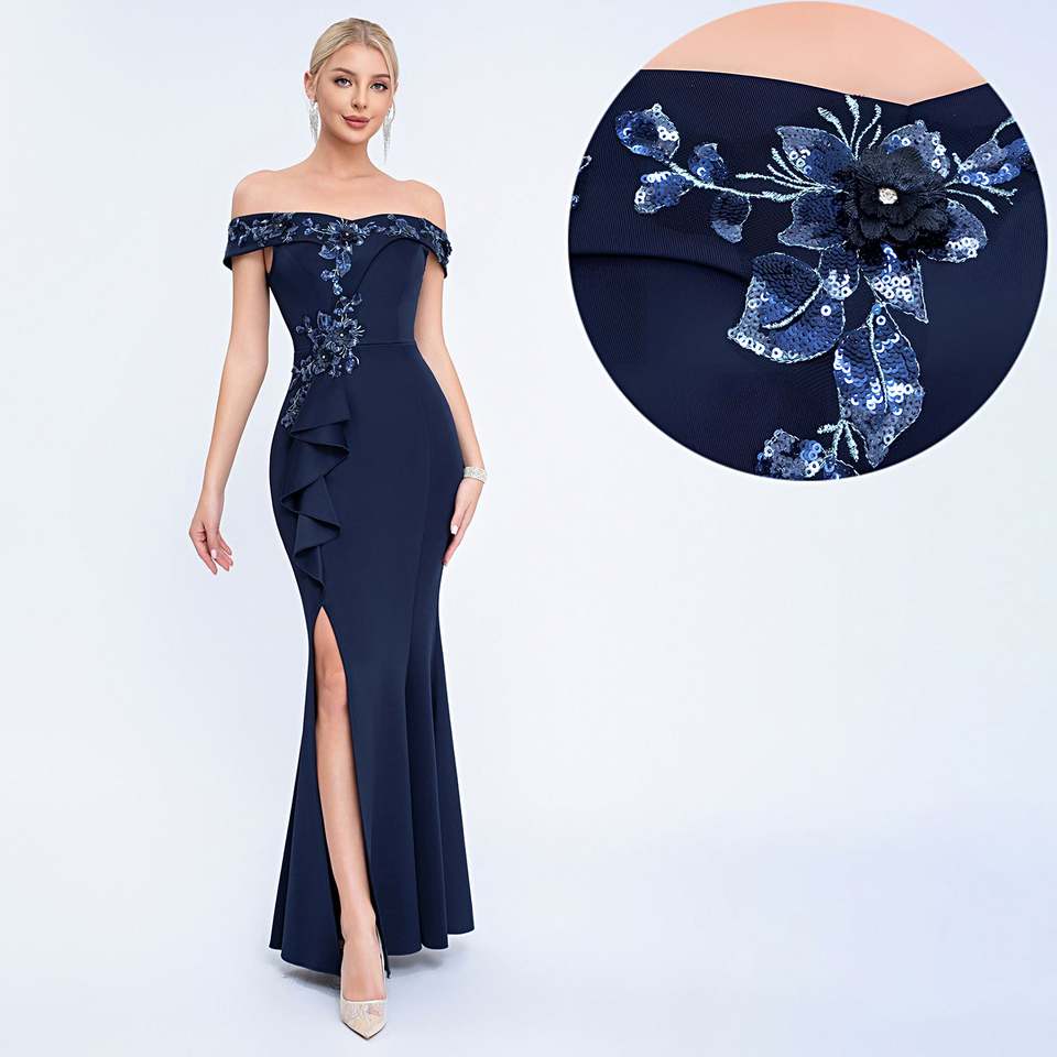 Personnalisation de haute qualité Robe de soirée à épaules décolletées Robe en queue de poisson taille haute Fleurs brodées avec paillettes Robes de soirée
