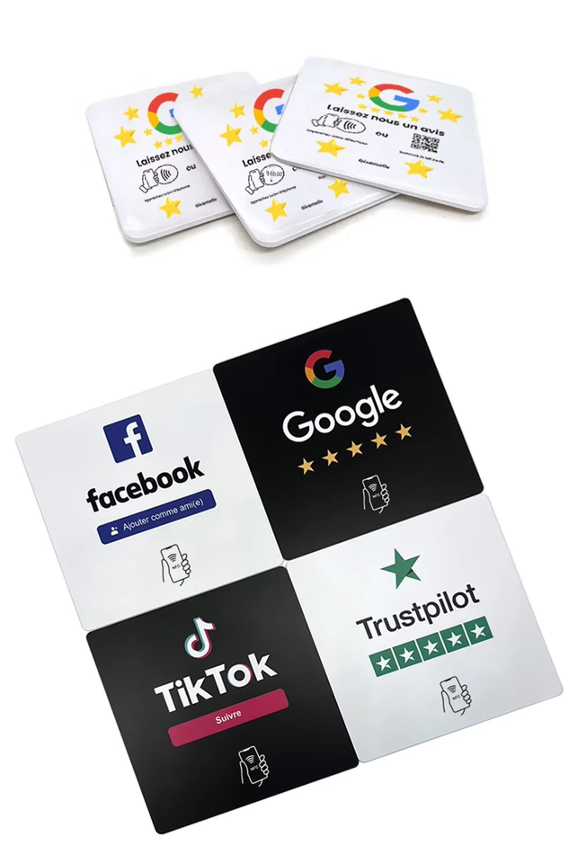 Cartes de visite personnalisées avec taille sur mesure, avis sur les réseaux sociaux (Google/Instagram/Facebook/TikTok), étiquettes NFC RFID miniatures, étanches, paiement hôtelier