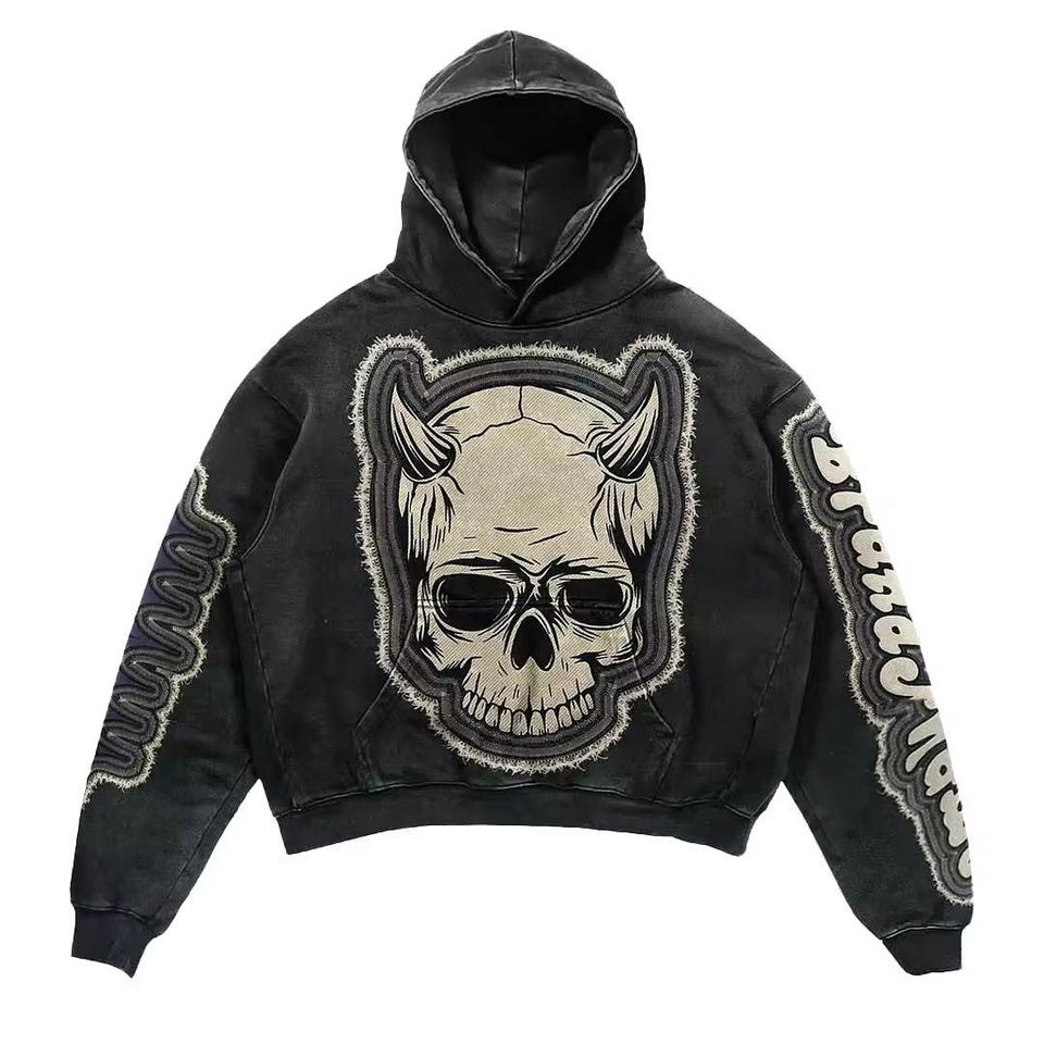 Sweat à capuche oversize personnalisé en molleton de coton d'hiver, coupe courte, effet vieilli, avec patchs brodés, impression numérique et strass