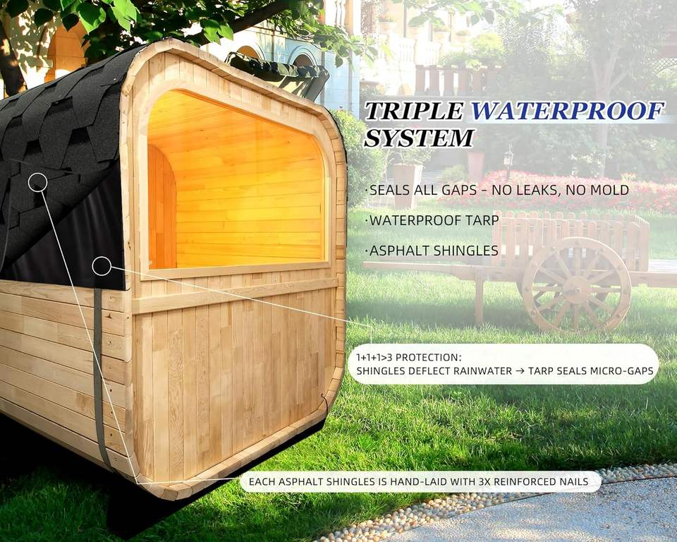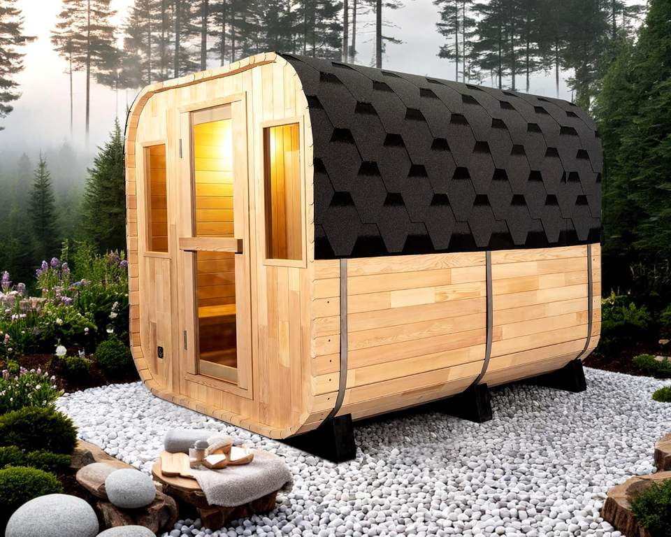 Sauna extérieur en cèdre rouge personnalisable pour 6 à 8 personnes avec option véranda, poêle à bois ou chauffage Harvia 8KW, pierres