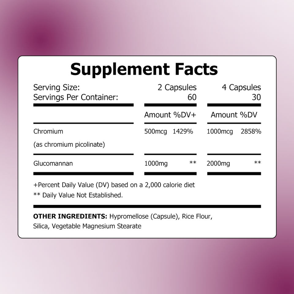 Ingrédient principal:Chrome, Glucomannane, Hypromellose, Farine de riz, Silice, Stéarate de magnésium végétal