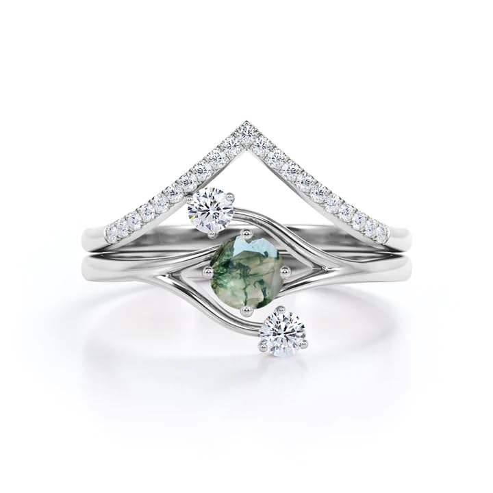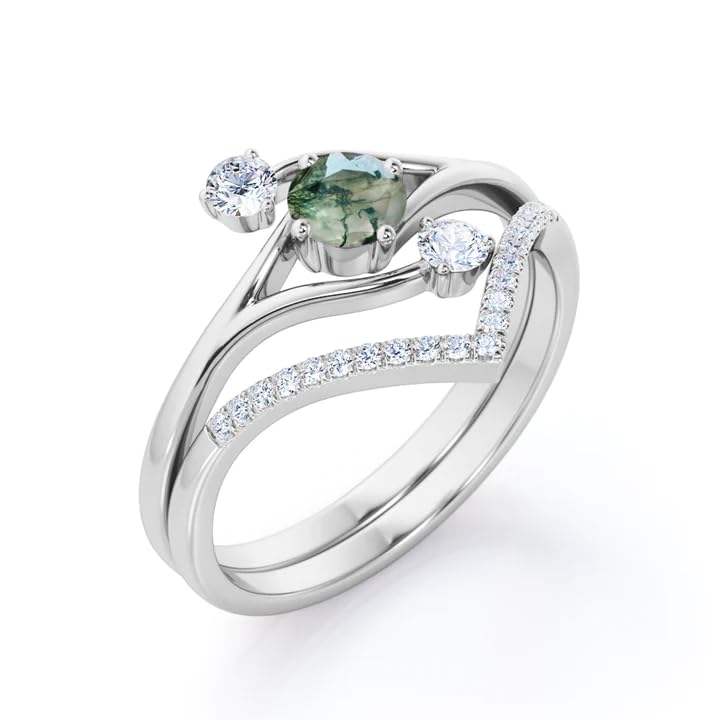 Bague Classique Trois Pierres en Agate Mousse et Moissanite, en Argent Sterling 925 Plaqué Or, Sertie à Griffes, pour Fiançailles, Mariage et Cérémonies