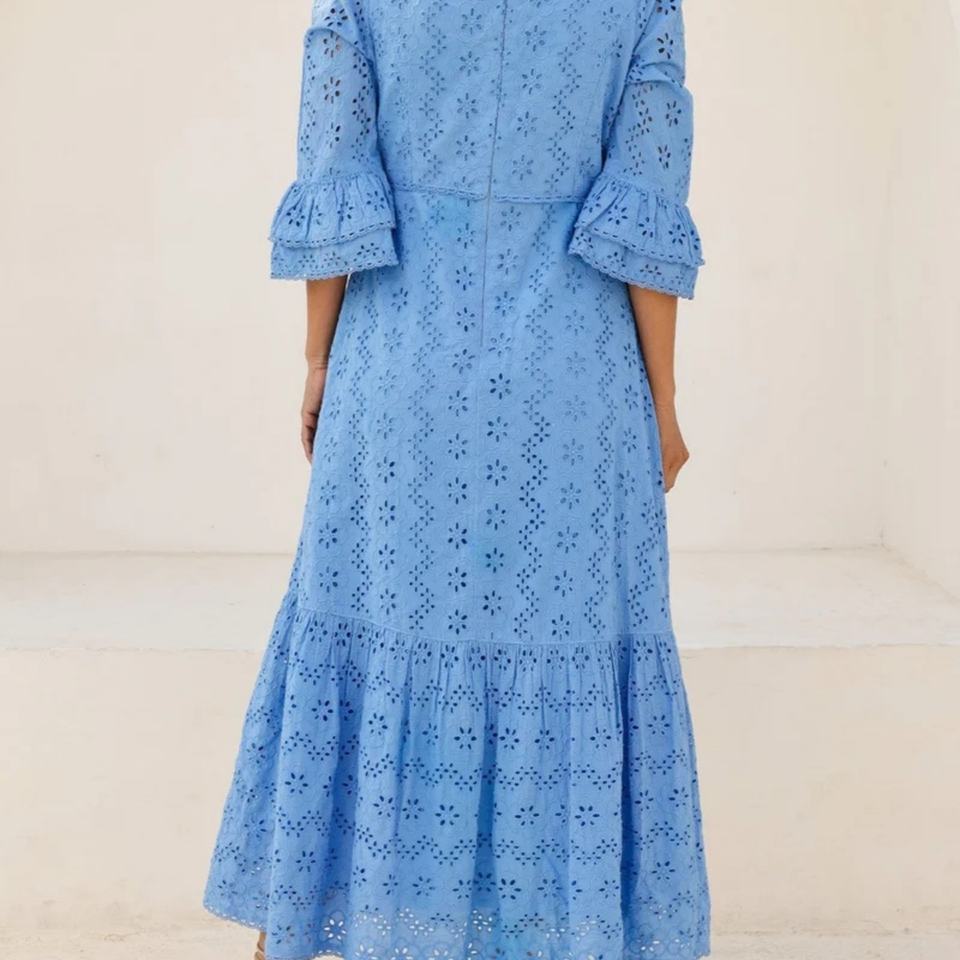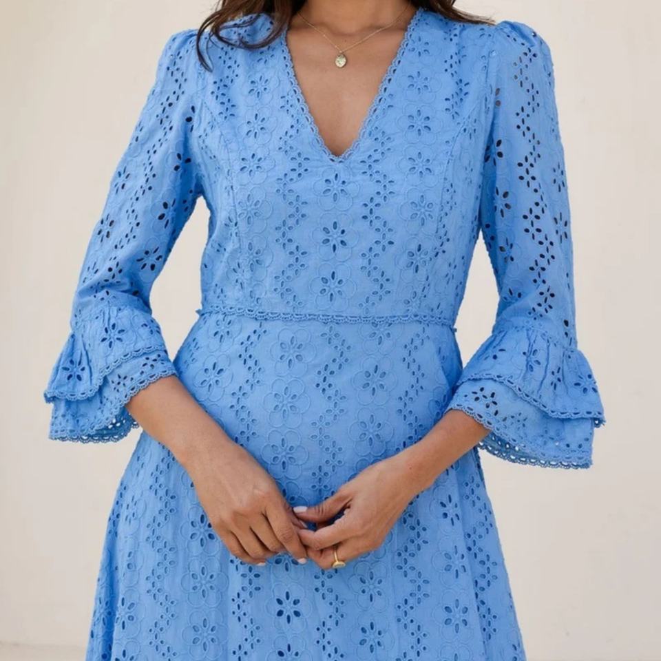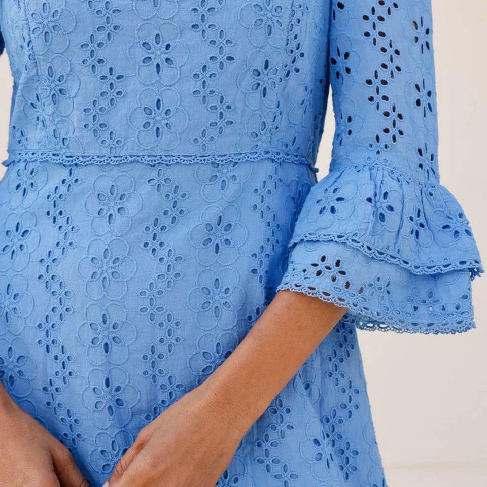 Robe midi élégante en coton et lin brodée à œillets, col en V, manches évasées, coupe trapèze, décontractée, pour femme
