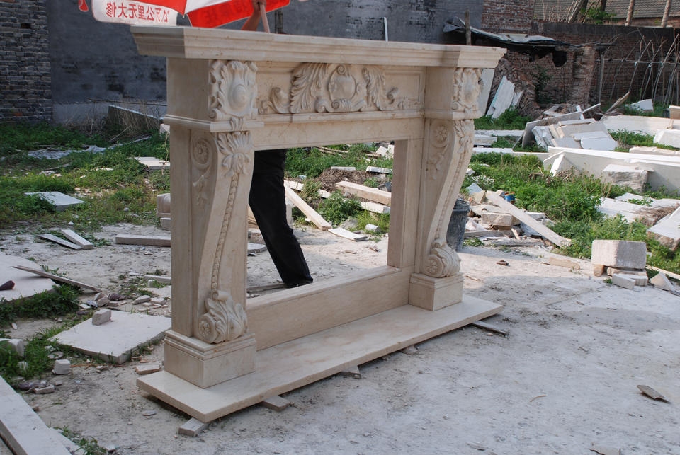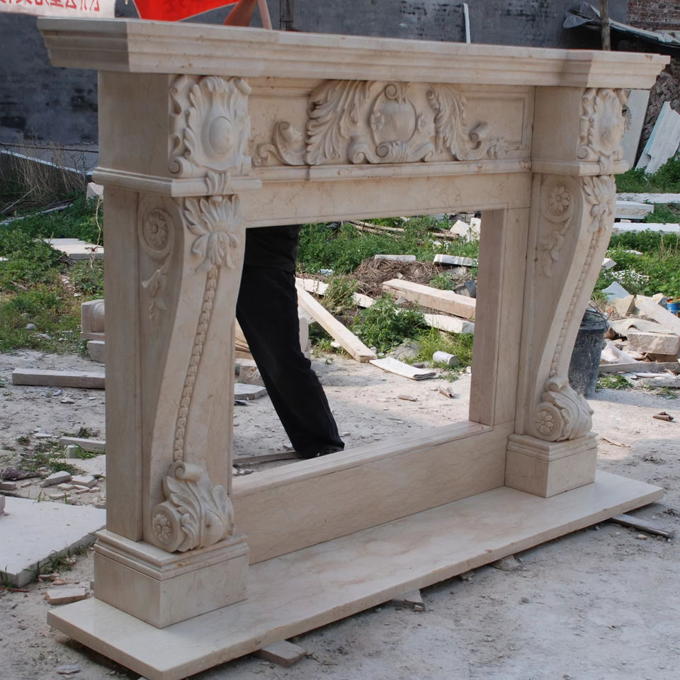 Cheminée classique européenne en marbre blanc, bouclier héraldique sculpté à la main, manteau en feuille d'acanthe, vente directe d'usine personnalisée