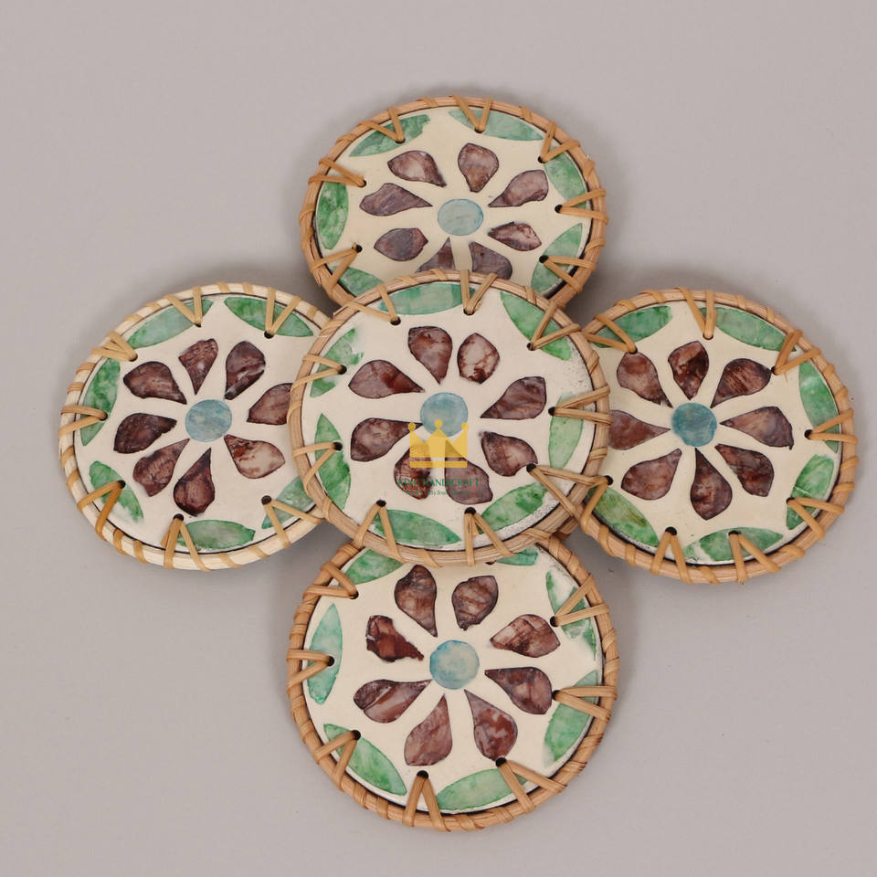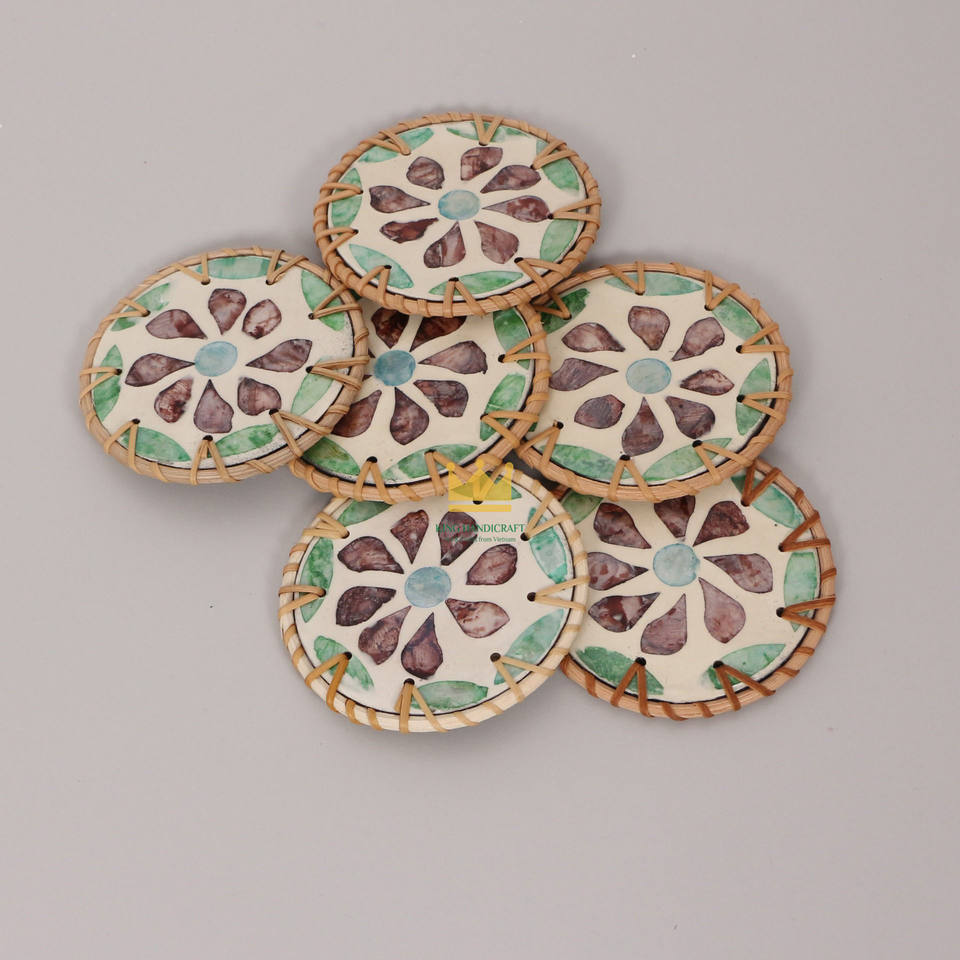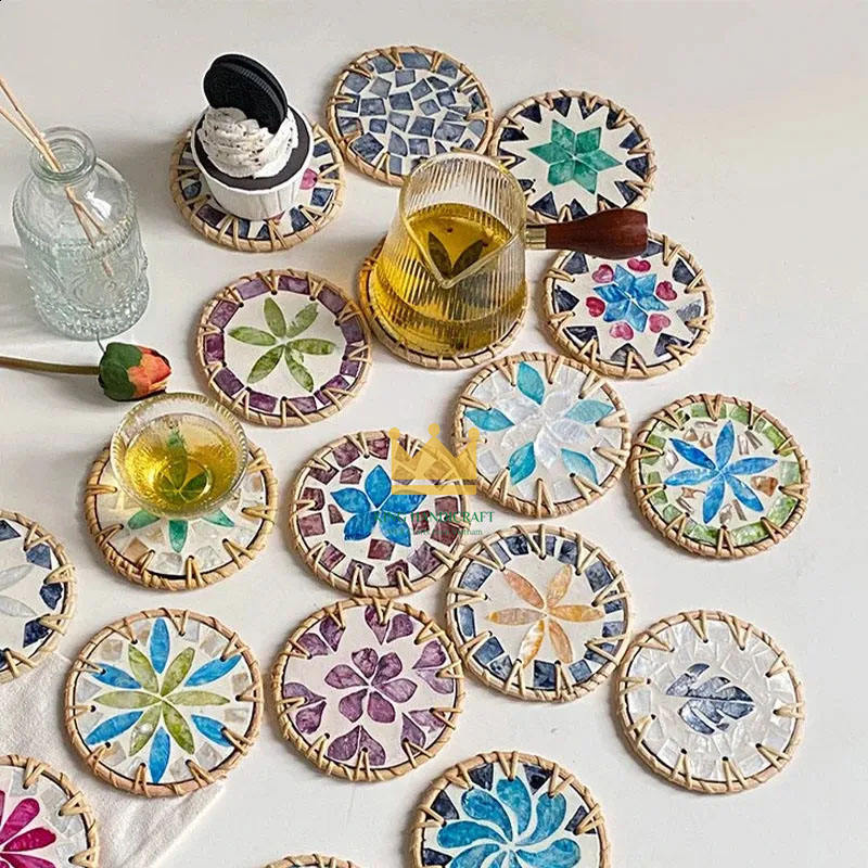 Tapis en rotin faits main personnalisables, style moderne, écologiques, motif nacre, origine Vietnam, pour la décoration de tables à café et à thé