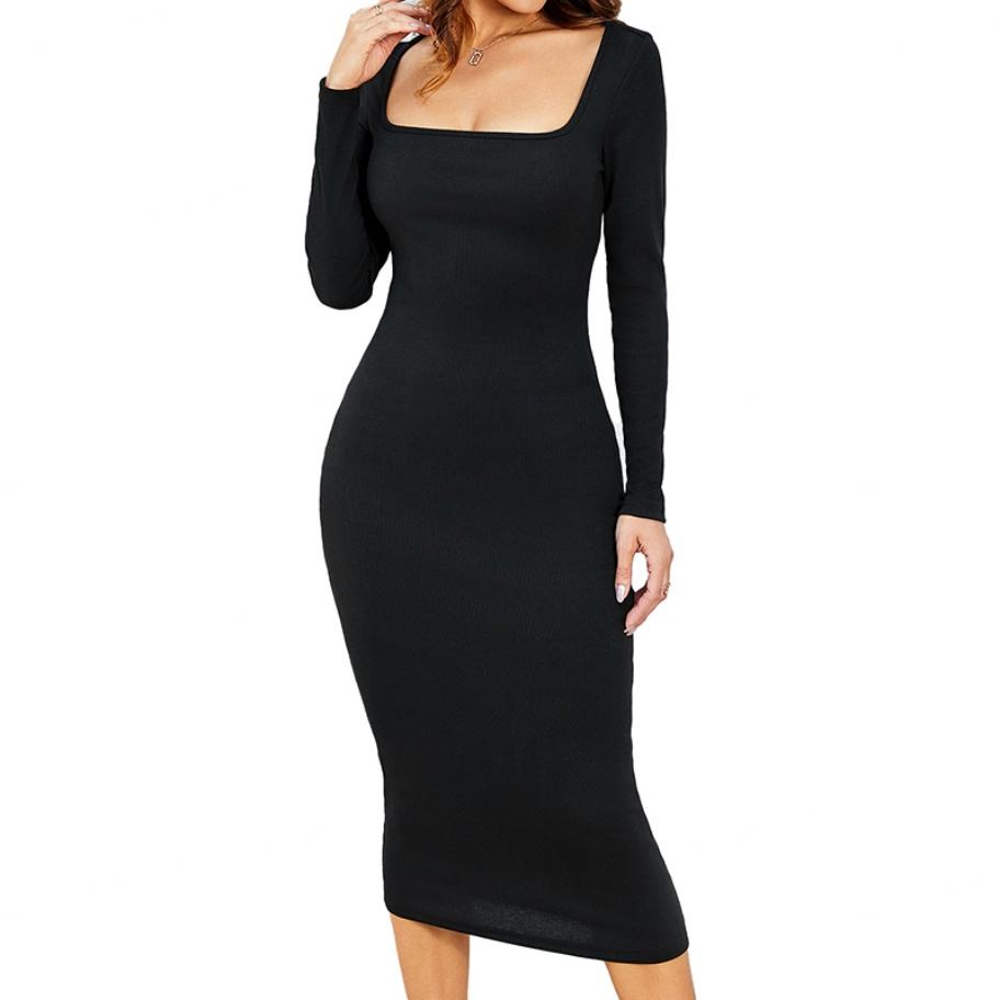 Robes midi en maille personnalisables, nouvelle collection hiver, de haute qualité, à col carré, manches longues, coupe ajustée, élégantes, style raffiné et séduisant