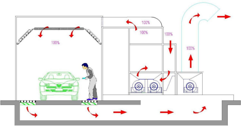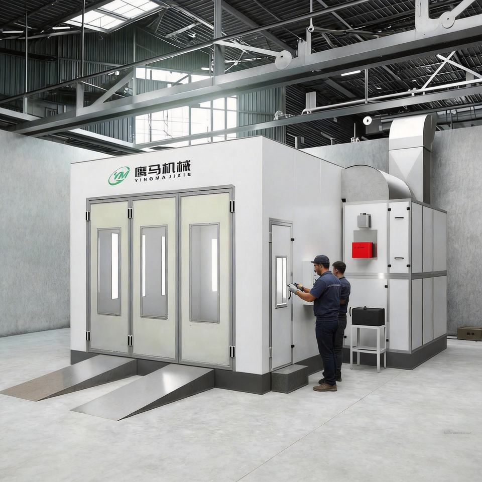 Cabine de peinture automobile à aspiration descendante entièrement éclairée par LED, taille intérieure personnalisable 8,5m x 4,2m x 2,8m