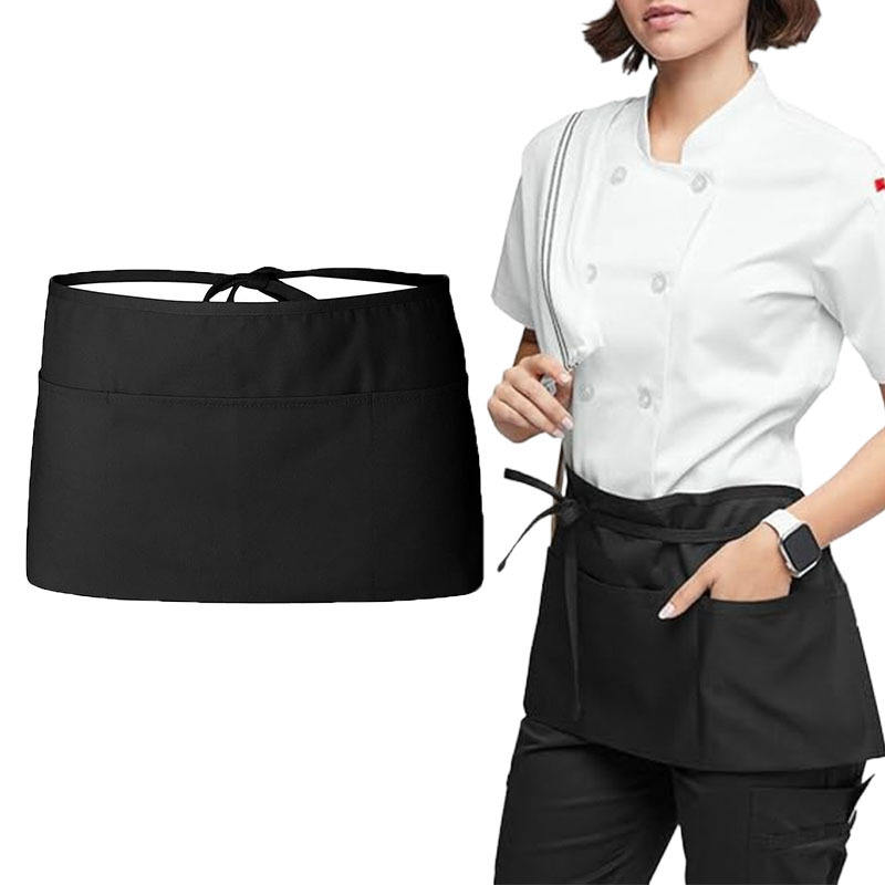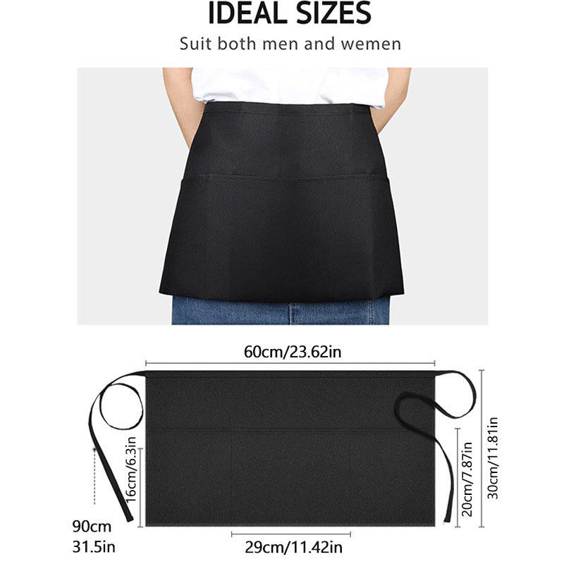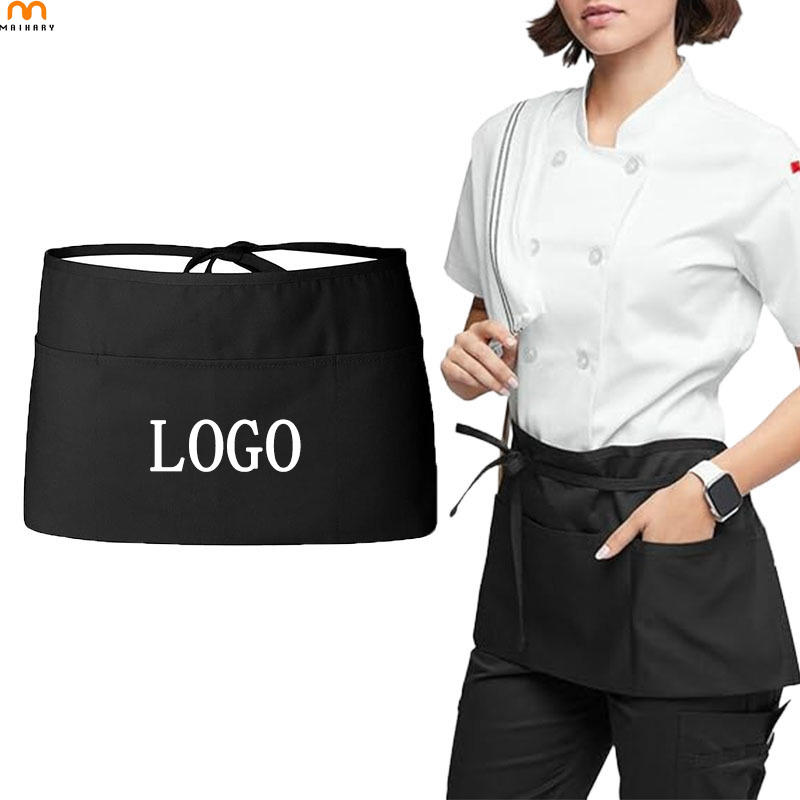 Tablier de cuisine de restaurant avec LOGO personnalisé Tablier de taille court pour serveur serveuse noire avec poches Demi-tablier de chef pour la cuisine