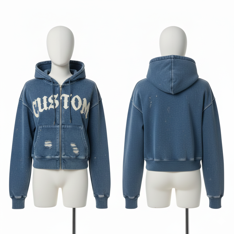 Sweat à capuche zippé vintage délavé à l'acide, coupe courte, manches longues, poids lourd 450 g/m², personnalisable avec logo