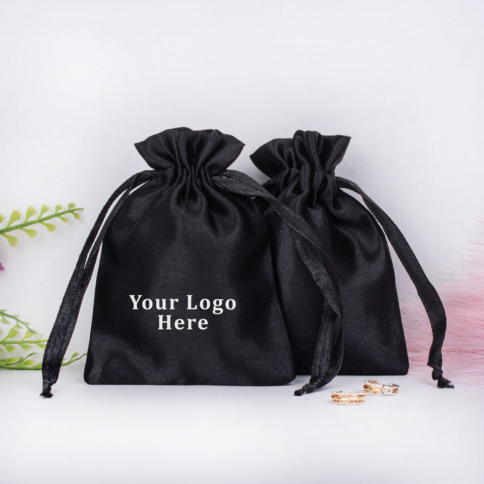 Pochette de rangement pour emballage de bijoux indiens, écologique et durable, avec cordon de serrage, sac de cadeau fait à la main en satin noir