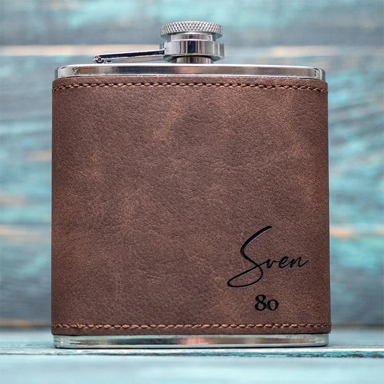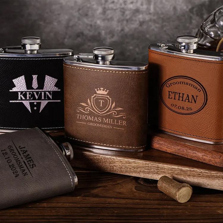 Flacons de hanche monogrammés avec logo personnalisé Flacon de hanche en cuir de 6oz en acier inoxydable avec couvercle en cuir végétalien