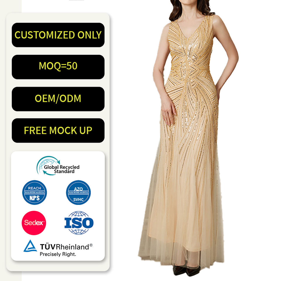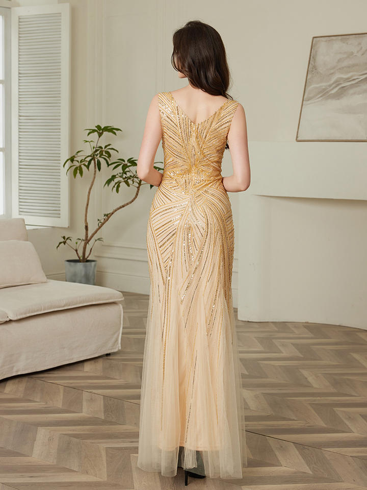 Robe de soirée longue élégante et fine pour femme, design luxueux personnalisé, col en V, champagne, sequins, tulle, vintage, galas