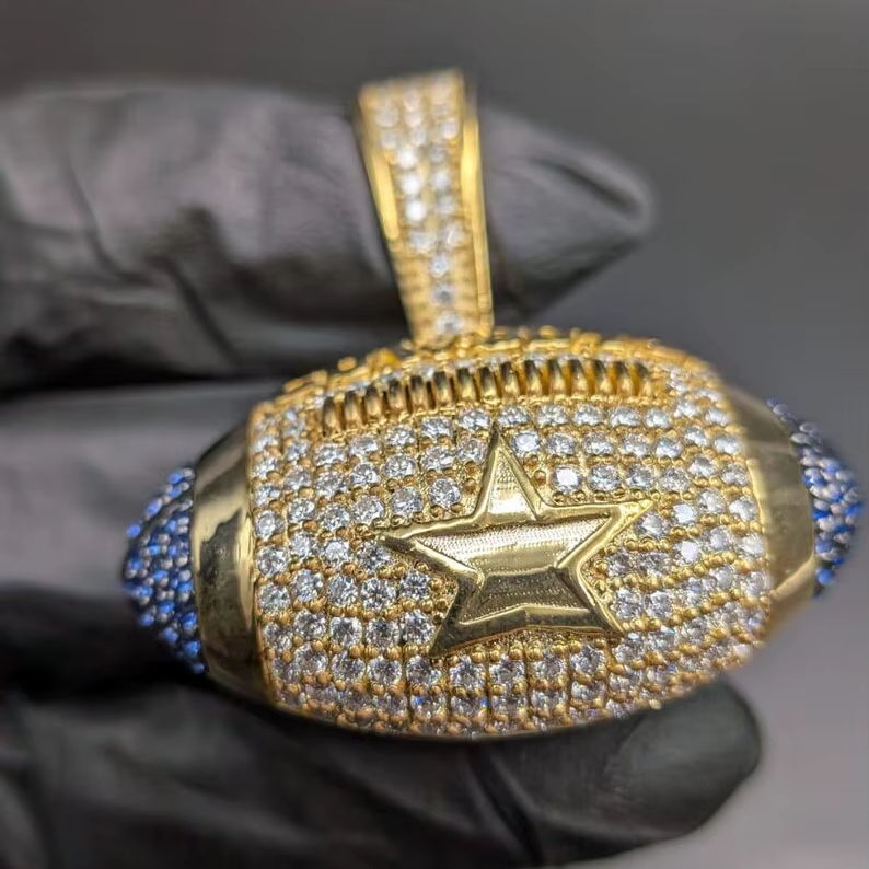 Pendentif Breloque Ballon de Rugby Personnalisable en Moissanite Plaqué Rhodium, Argent Sterling 925 Glacé, Bijou de Mode Style Sportif pour Hommes