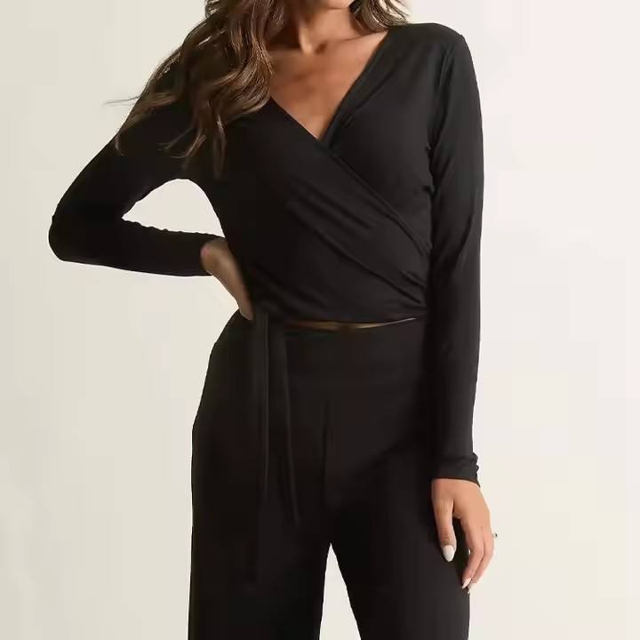 Customize logo beauty top ' Women's Blouses Breathable Long-Sleeve Wrap Tops with Adjustable Ties Crossover Neckline Ladies Tops