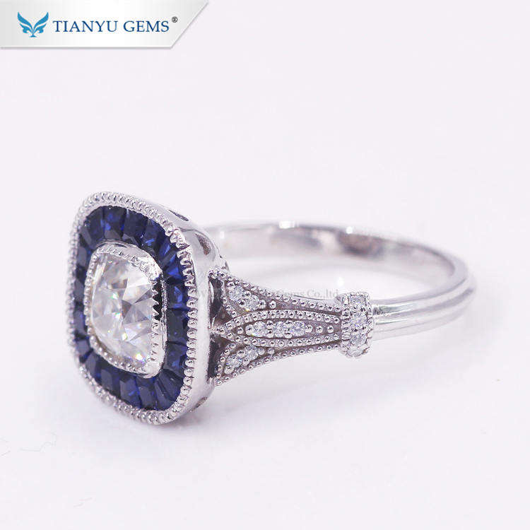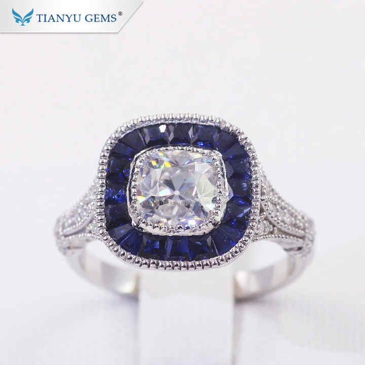 Bague personnalisée en or blanc 14k/18k 6.5*6.5mm Coussin Old Mine Cut Moissanite 34 # Bague de fiançailles en saphir synthétique