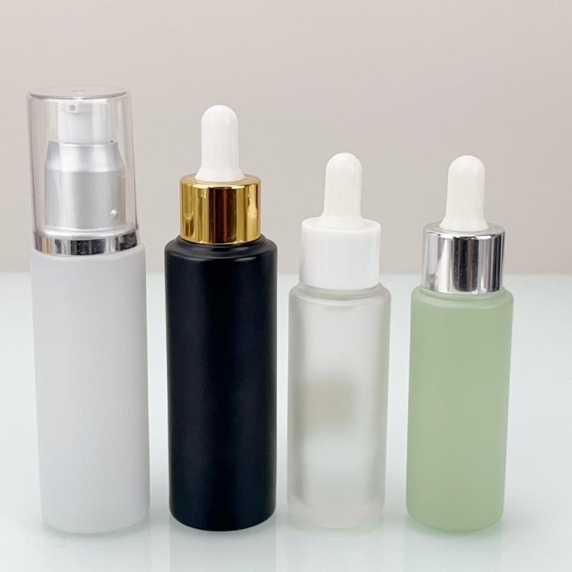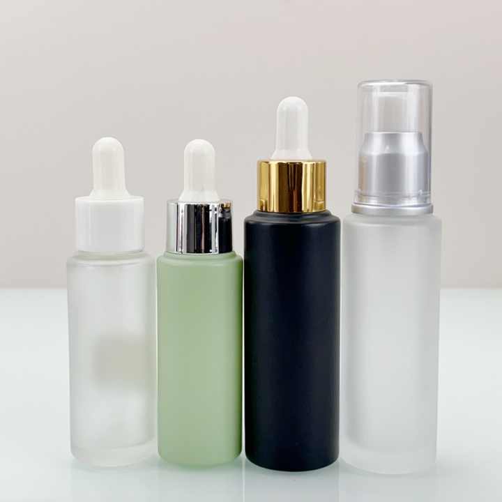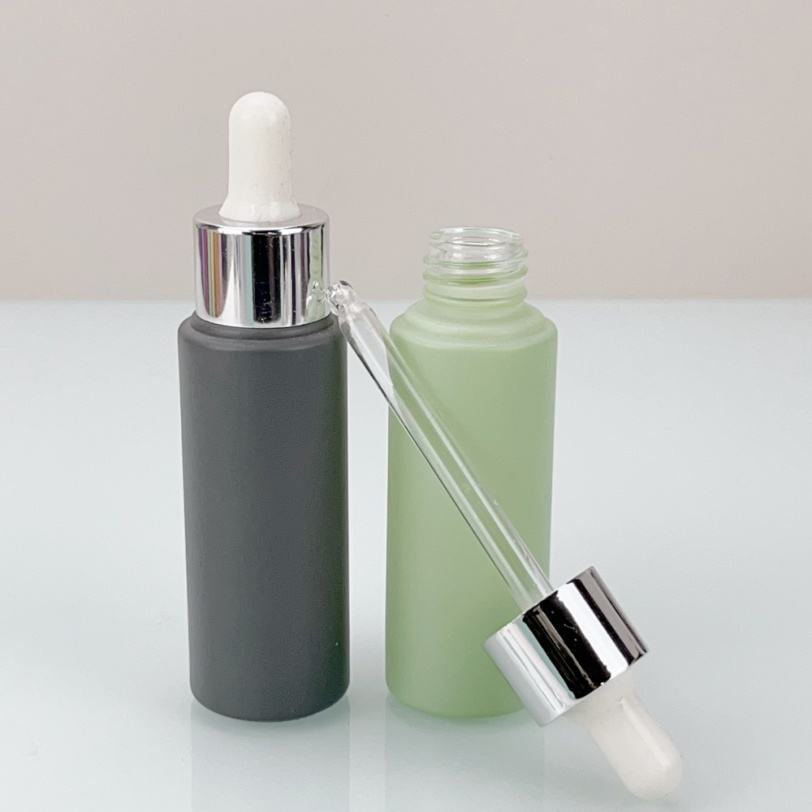 Bouteilles compte-gouttes en verre rondes colorées personnalisées de 15 ml, 20 ml, 25 ml, 30 ml, 50 ml pour huiles essentielles avec bouchon pompe en aluminium