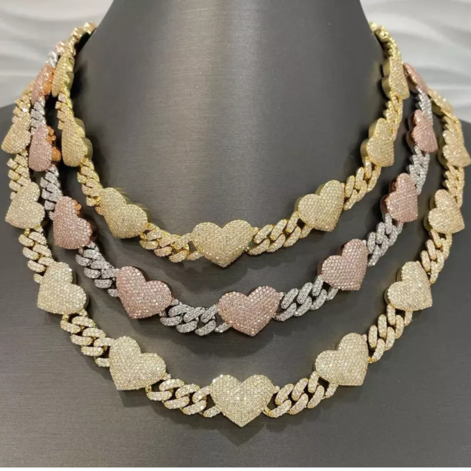 Personnalisé 18mm Cubain Link Heart Moissanite Diamond Chain 925 Sterling Silver Yellow Gold Necklace Produit de haute qualité