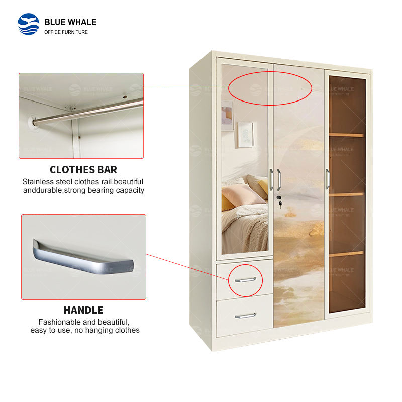Armoire en acier imprimée à 3 portes personnalisée avec miroir et verre, revêtement écologique, anti-humidité, OEM/ODM Lemari Besi