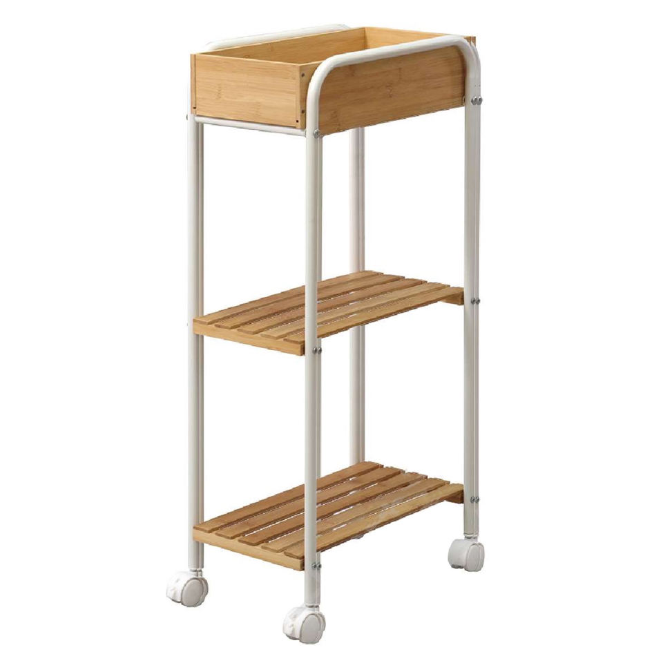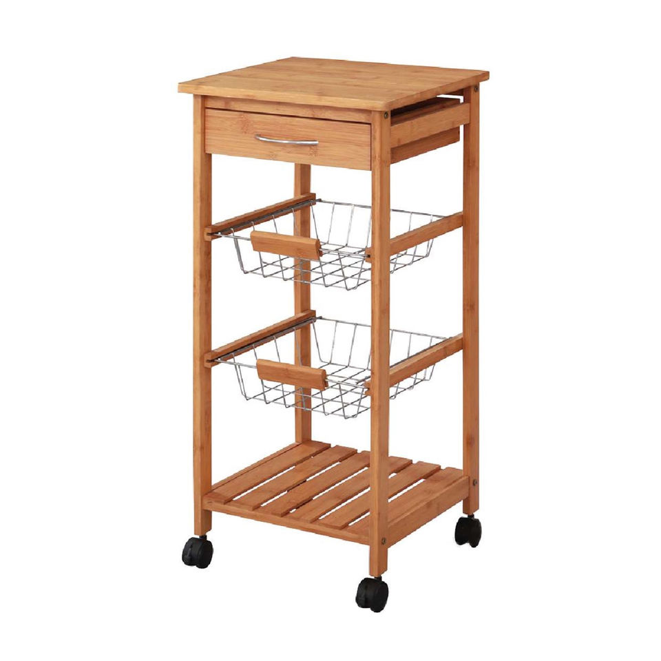 Chariot de service de cuisine en bambou à 4 niveaux personnalisé sur roues avec tiroir réglable, panier et plateau amovibles en fil métallique