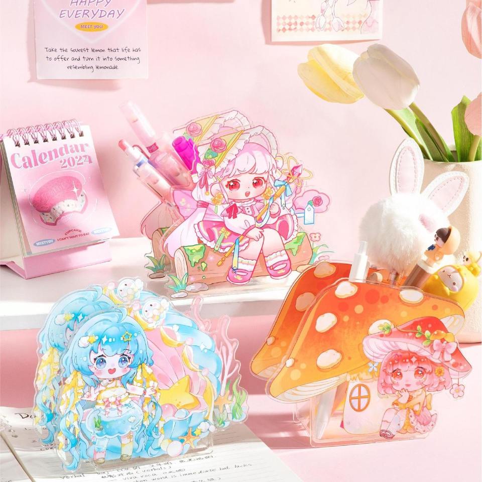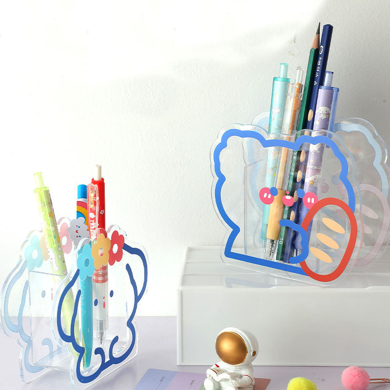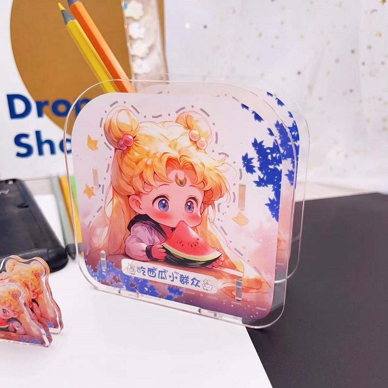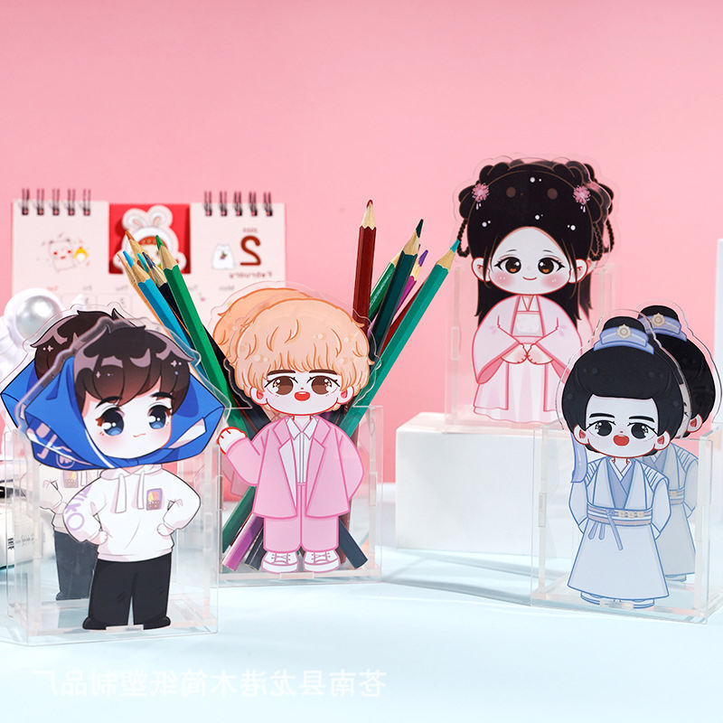 Porte-stylo en acrylique personnalisé Anime Desk Logo Cute Cartoon Container Pen Holder Kawai Plastic Pen Holder with Photo Frame